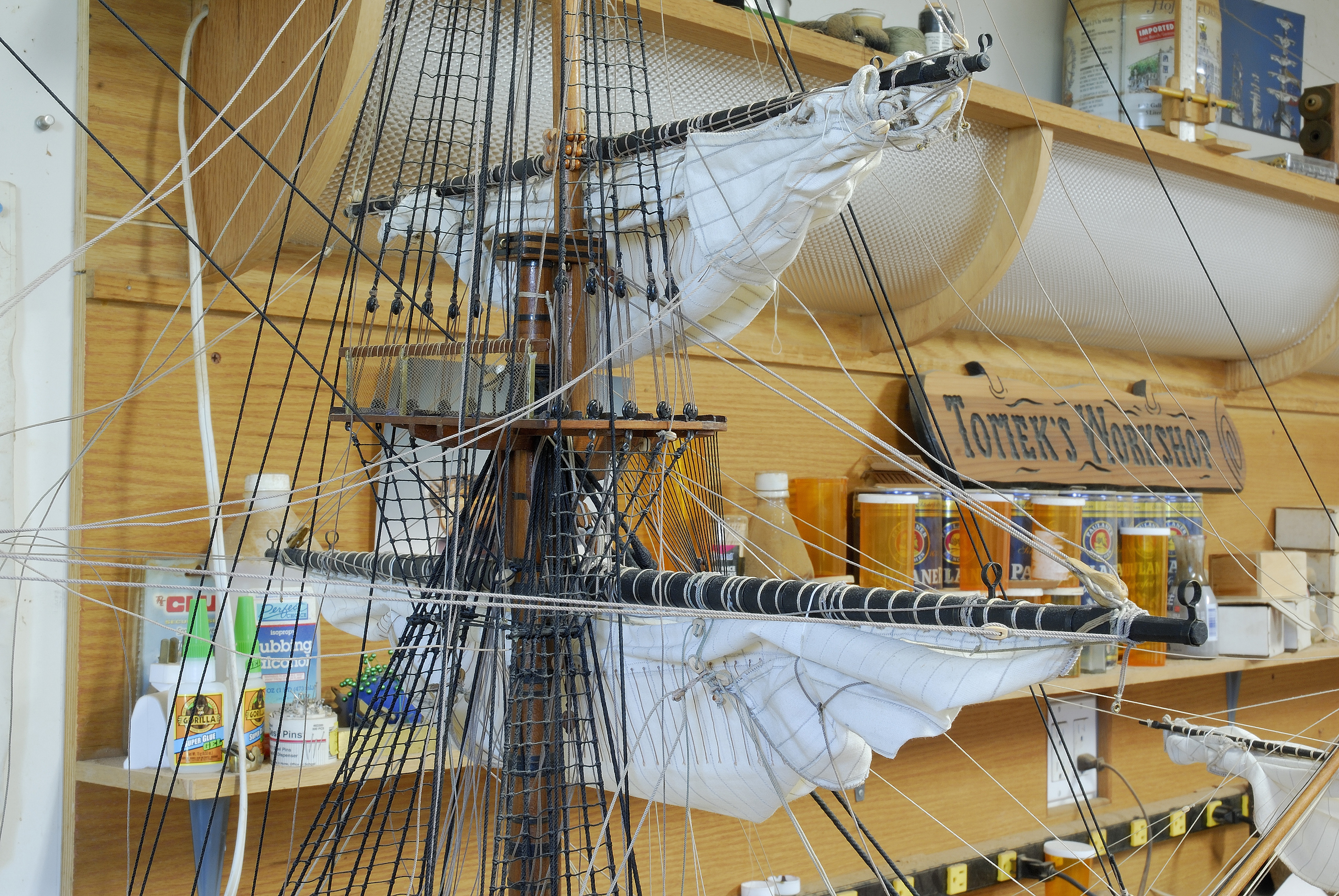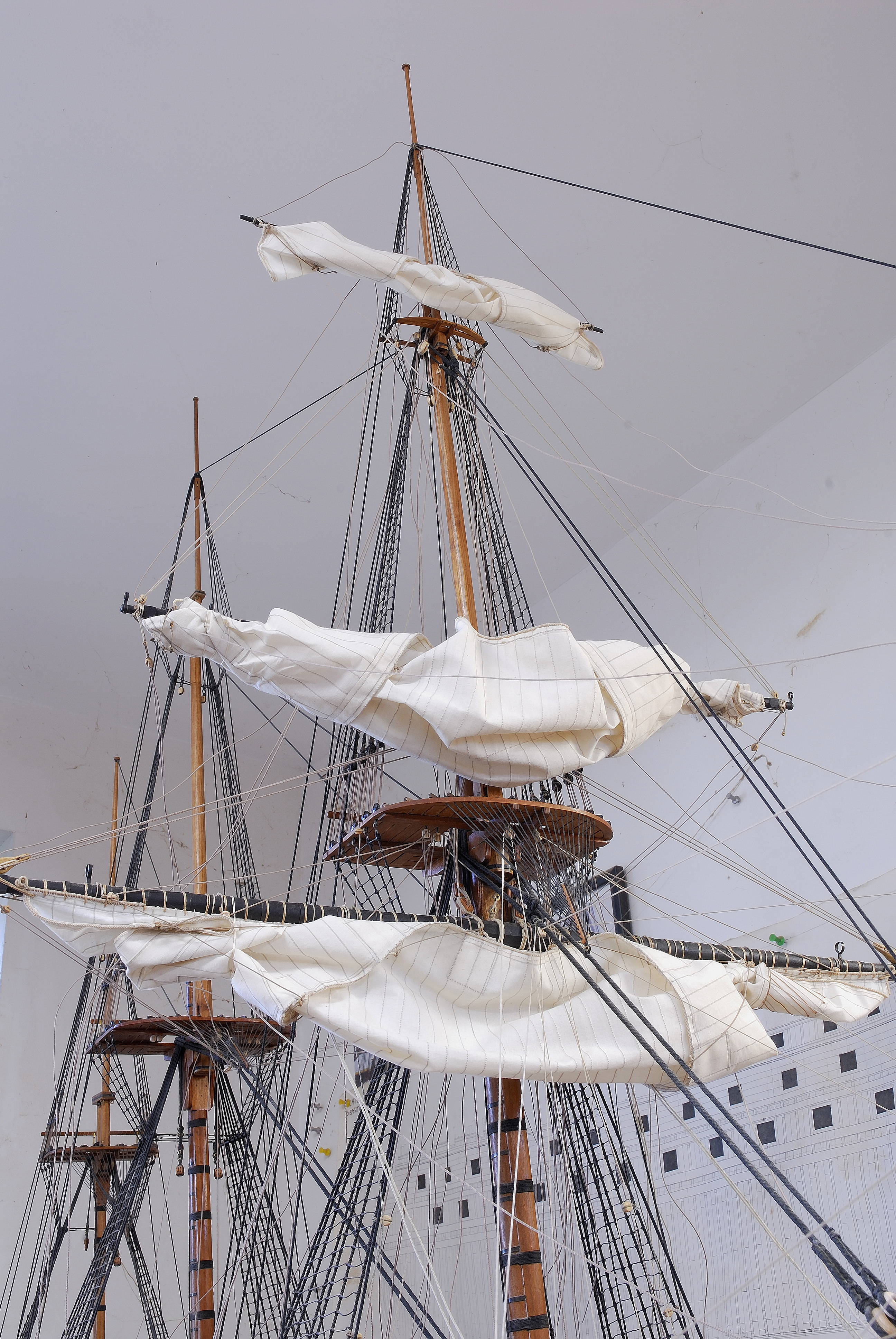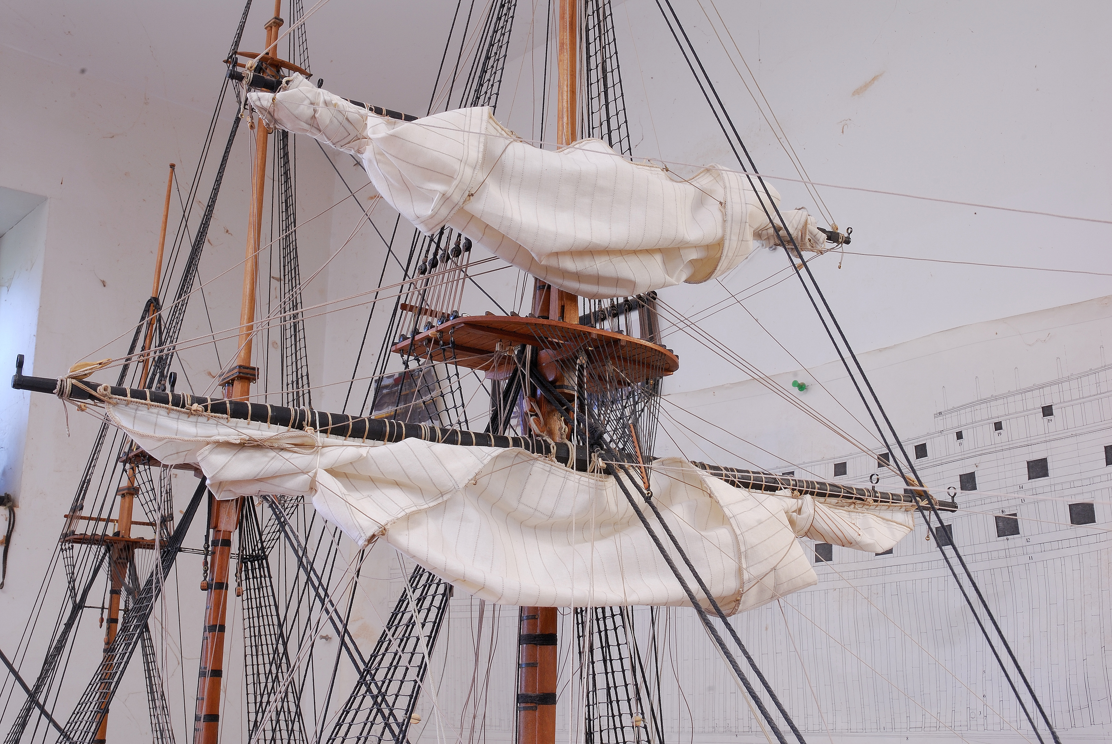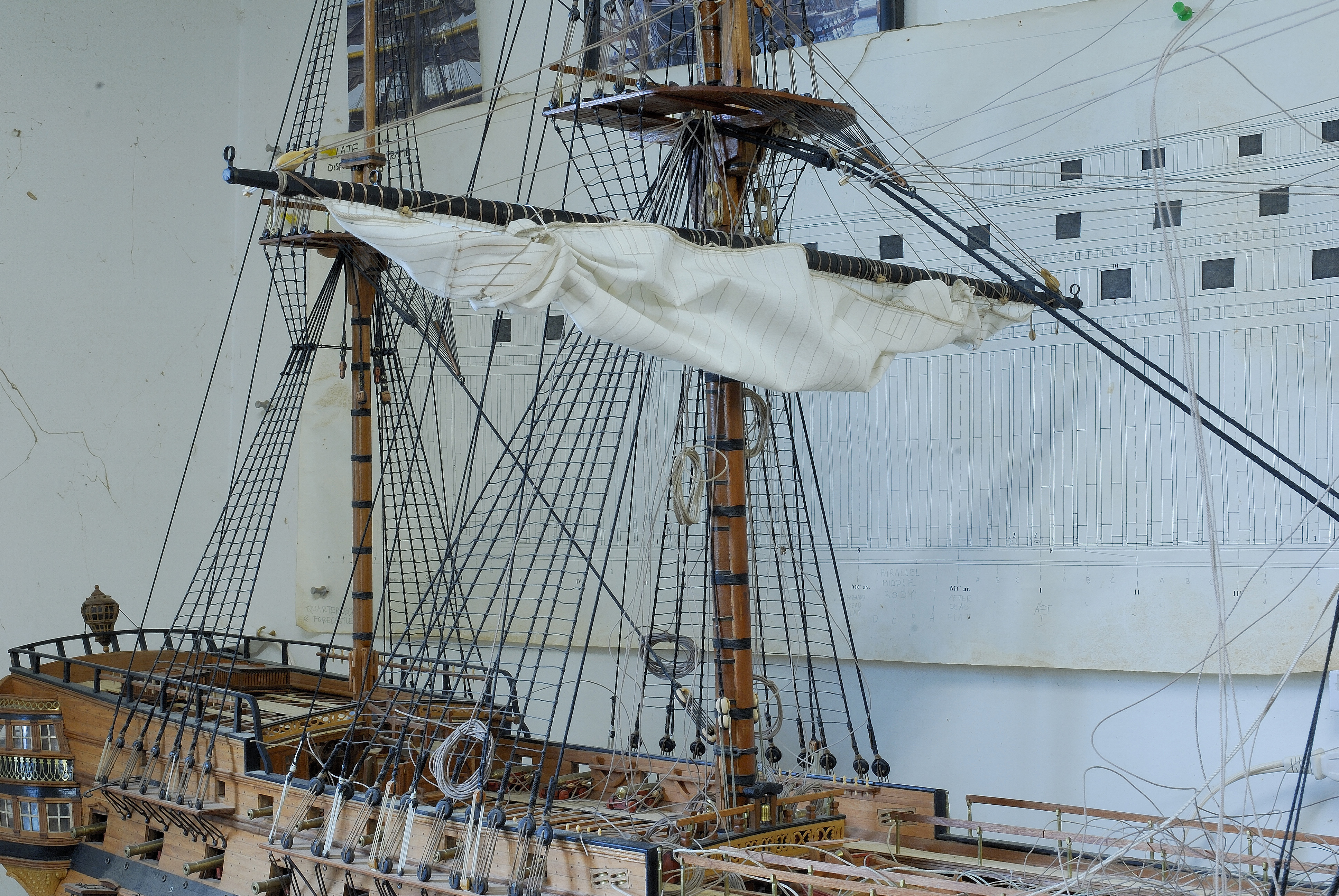 Pomalenku brne do przodu, dzis wreszcie udalo mi sie powiesic glowny zagiel od grotmasztu i wstepnie go uformowac do konfiguracji tzw. brailed up (nie znam polskiego terminu) - plotno czesciowo zwiniete... Pajeczyna linek jest zamocowana do rei i zagli, ale dolne ich konce (running ends) jeszcze nie sa zamocowane na stale w przynaleznych im miejscach na kadlubie, do nagli (belaying pins), pacholow czy w knagach wantowych i sa rozrzucone luzno...