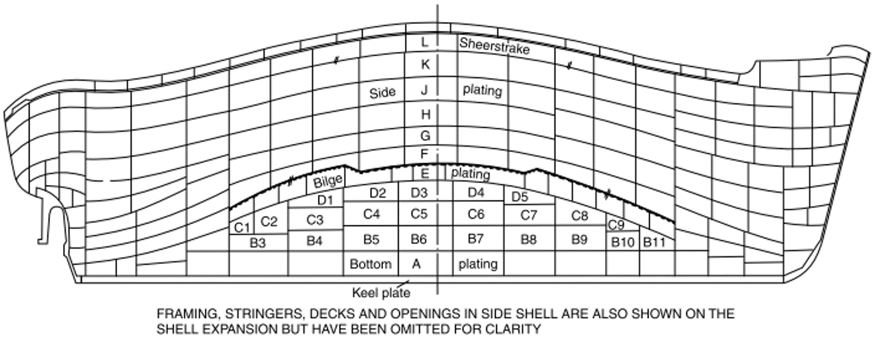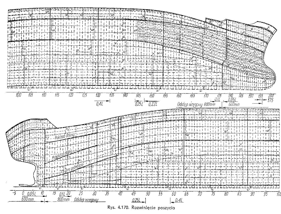Załączam Ci rysunek rozwinięcia poszycia kadłuba. Szerokości blach rysowane są w rzeczywistych rozwinięciach, stąd zniekształcony rysunek wysokości kadłuba. Blachy układane są pasami o stępki do nadburcia czyli pasy pd k - kil a potem rzędami od A do Z.