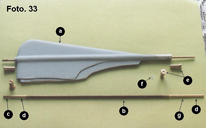 Do jednej z połówek wklejamy dwa pełne profile żeberek dla wzmocnienia płetwy i lepszego wklejenia trzonu steru. Po utwardzeniu się kleju na połączeniu żeberko skorupa przystąpiłem do punktowego wklejenia tymczasowego trzonu steru. Trzon właściwy może być wykonany z dowolnego materiału. W moim przypadku z pręta mosiężnego o odpowiedniej grubości. Trzon ma dwa podtoczenia oporowe. Dolne o średnicy i długości tulejki ślizgowej, jaka będzie zamontowana w ostrodze. Drugie górne również oporowe ponad płetwą, a tuż pod kadłubem. Średnica podtoczenia równa wewnętrznej średnicy tulei trzonu steru, tuż nad tuleją podtoczenie, a długość na tyle duża, aby zamocować kwadrant lub ramię do popychacza. Kiedy już wszystko ustawiłem prawidłowo i sprawdziłem można trzon przykleić do skorupki i żeberek. Następnie tylko pozostaje przykleić drugą połówkę skorupki. Całość wyszpachlować wyszlifować do gładkości i pomalować podkładem. Gotową płetwę steru kierunku przedstawia foto. 32.