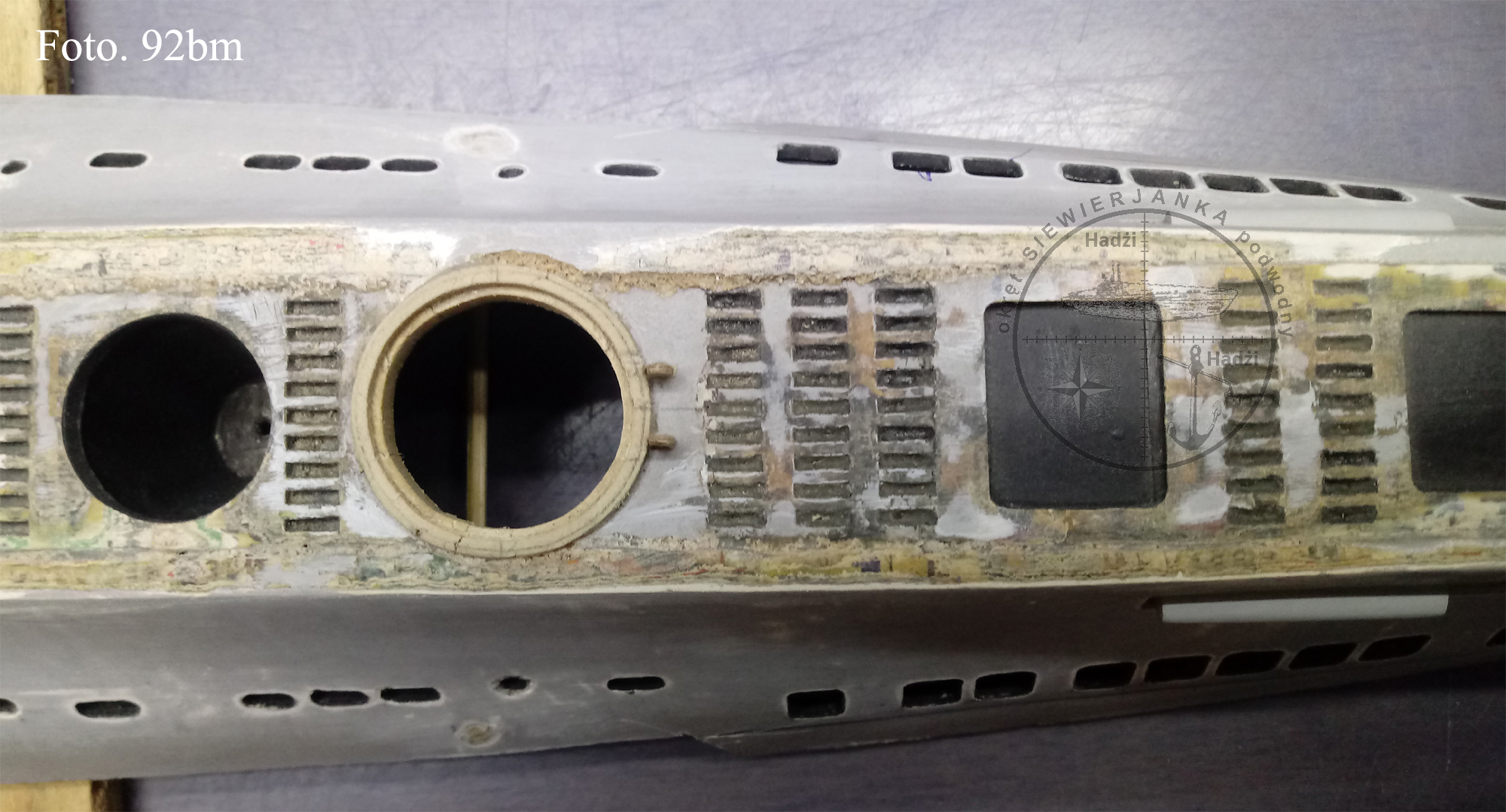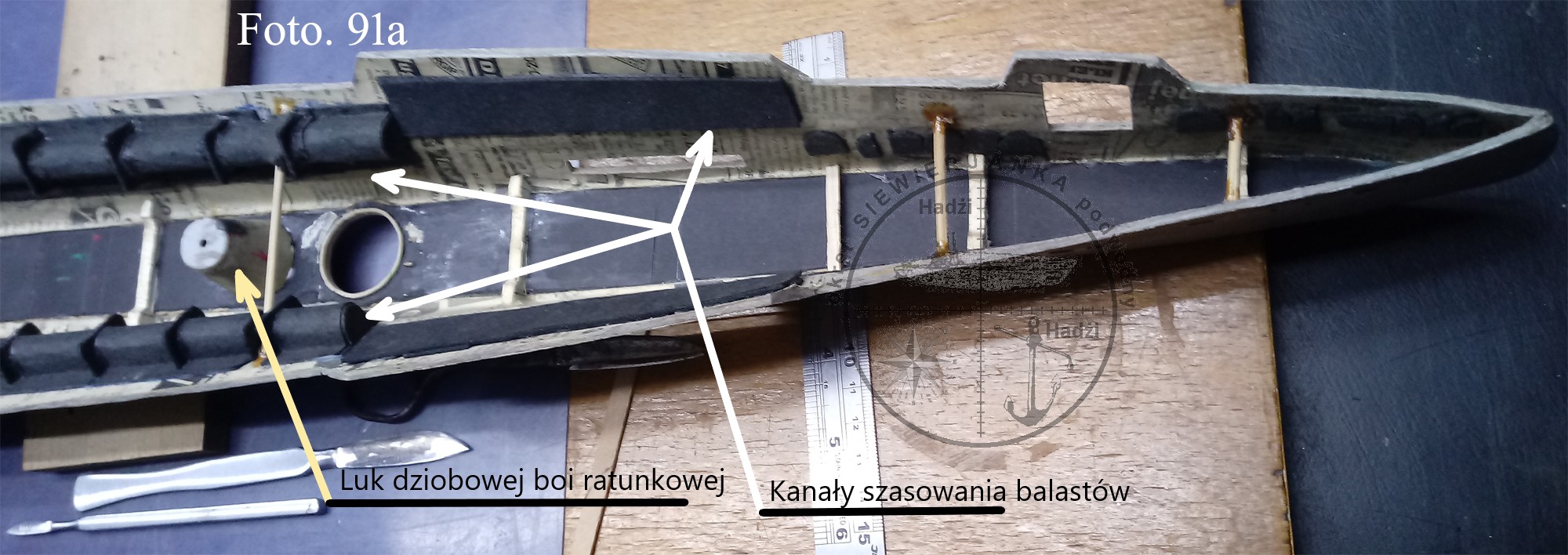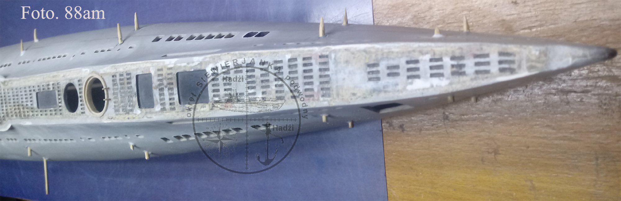 W odciętej nawodnej części kadłuba zostały wklejone uprzednio wykonane kanały szasowania balastów. Wklejone zostały też dziobowy i rufowy luk boi ratunkowych. Pozostało jeszcze do wklejenia kluza kotwiczna i kaseta dziobowych sterów głębokości. Część dziobowa przedstawia się tak: A rufowa tak: W części śródokręcia są wklejone kanały tak jak w dziobowej i rufowej.