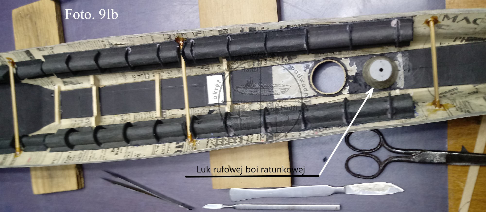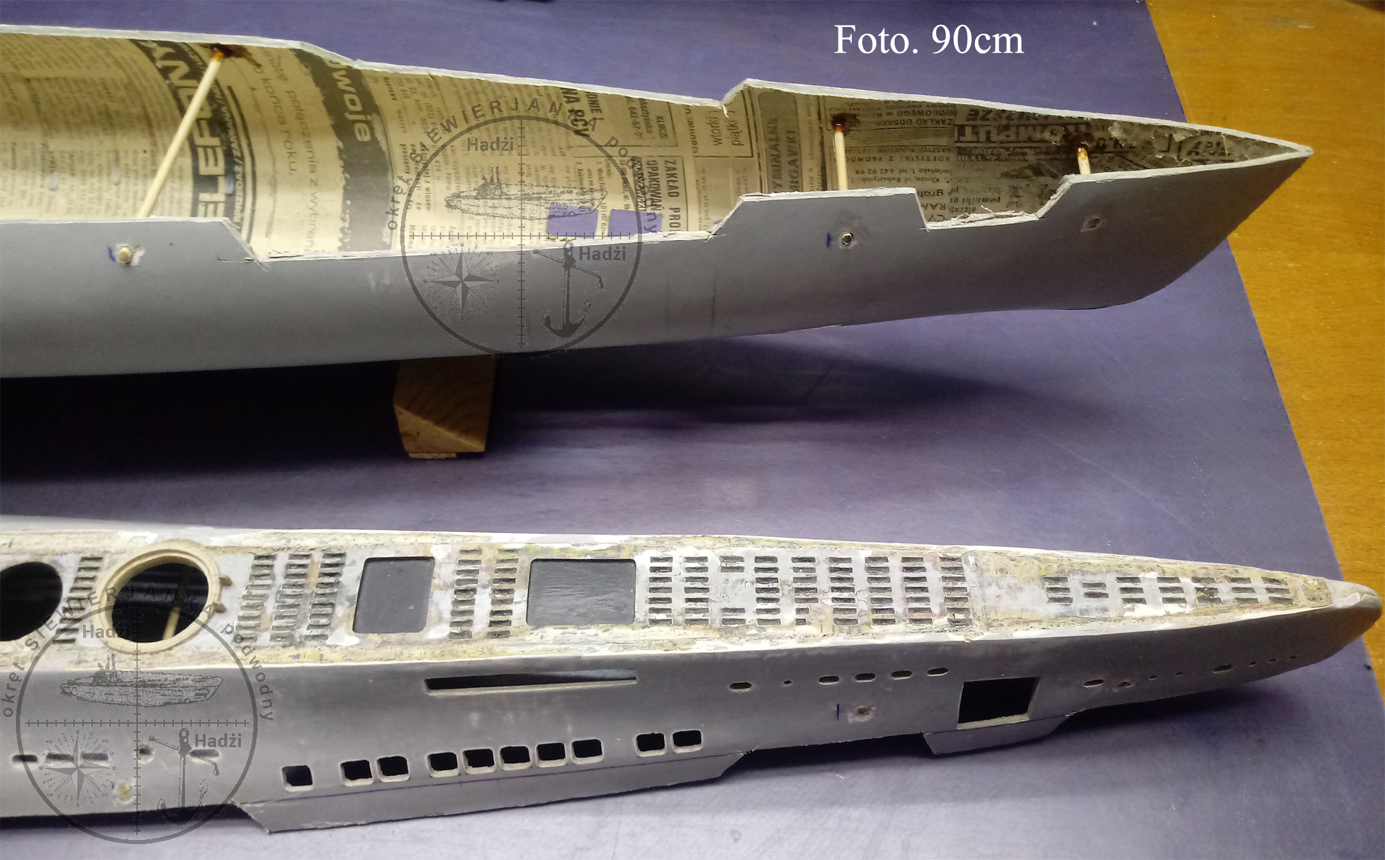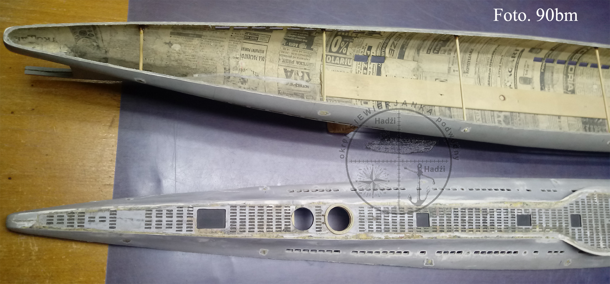 W odciętej nawodnej części kadłuba zostały wklejone uprzednio wykonane kanały szasowania balastów. Wklejone zostały też dziobowy i rufowy luk boi ratunkowych. Pozostało jeszcze do wklejenia kluza kotwiczna i kaseta dziobowych sterów głębokości. Część dziobowa przedstawia się tak: A rufowa tak: W części śródokręcia są wklejone kanały tak jak w dziobowej i rufowej.