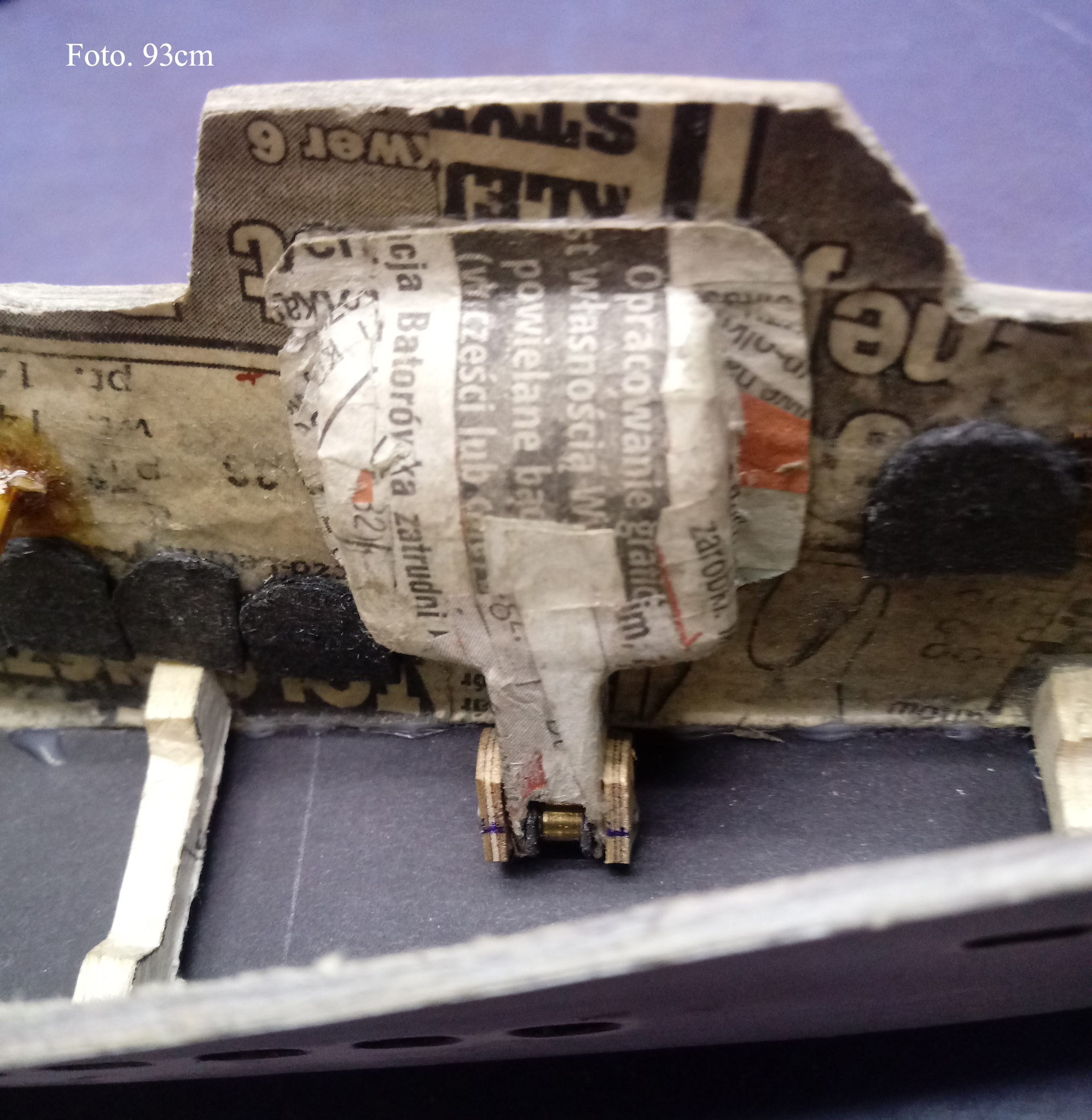 Nie jestem pewien czy po rozcięciu skorupy kadłuba wzdłuż linii KLW ona nie zmieni swego kształtu. Wolę nie ryzykować. Nawierciłem, więc otwory nad linią i pod linią na obu burtach. Wkleiłem w nie patyki szaszłykowe.