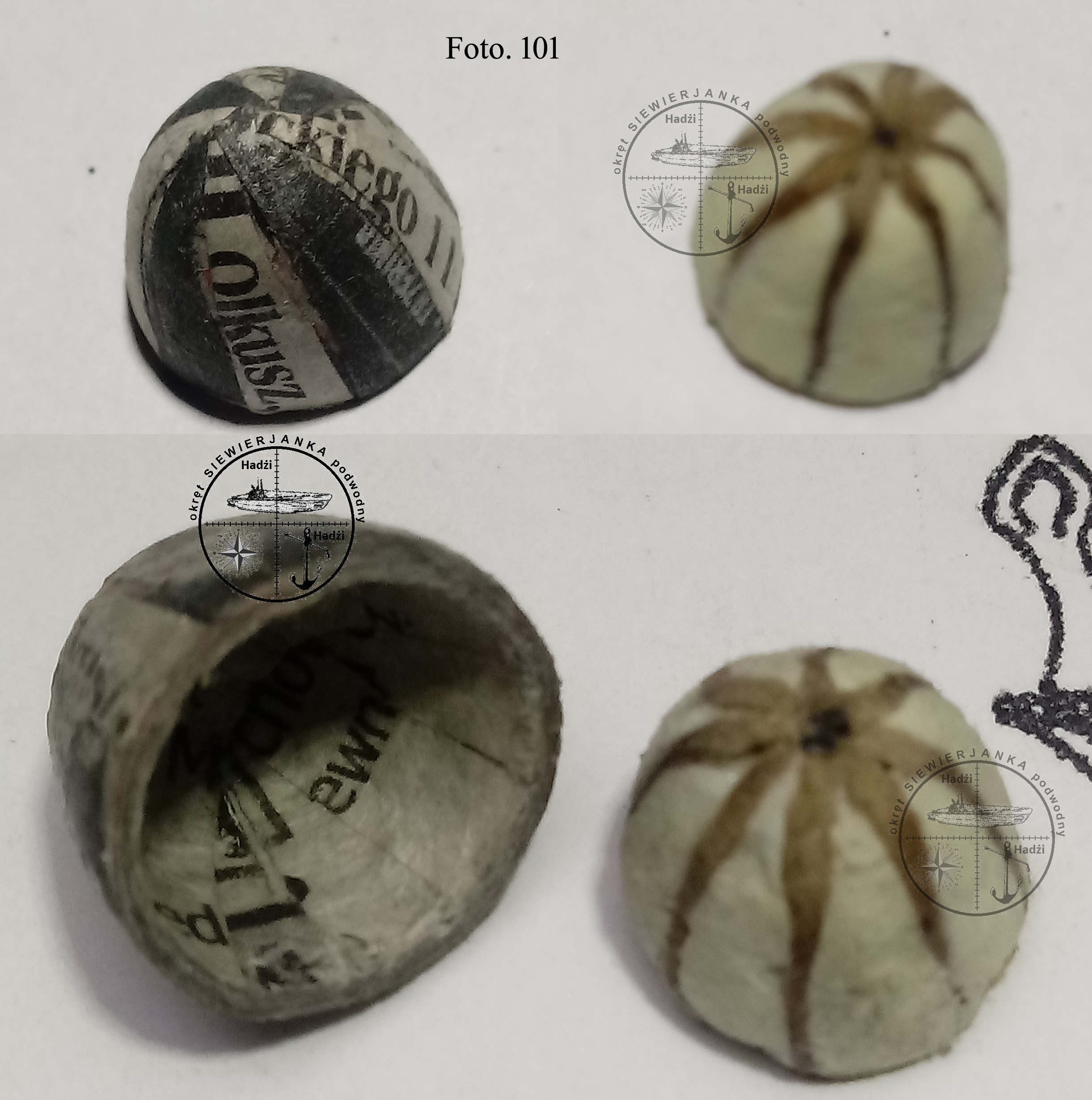 Przystąpiłem też do wykonania elementów reflektora dziobowego. Do wykonania obudowy reflektora zastosowałem tą samą metodę skorupową. Czyli najpierw wykonałem kopytko. Następnie nakleiłem dziesięć warstw pasków gazetowych i powstała skorupa po zdjęciu z kopytka. Widok przedstawia foto. 101. Drugi element został wystrugany i wyprofilowany z kawałka drewna. Uwidoczniony na foto. 102.W późniejszym czasie zostanie wykonane szkło z pleksy lub poliwęglanu, po wykonaniu odbłyśnika i końcowym malowaniu. Myślałem, aby wykonać ten reflektor świecący, ale problem będzie z doprowadzeniem zasilania. Nie spotkałem kabla dwużyłowego o średnicy zewnętrznej 1,5 mm. Zastanawiam się nad światłowodem. Dioda w odbłyśniku dałaby oczekiwany efekt, a czy końcówka światłowodu też? Tego nie wiem.