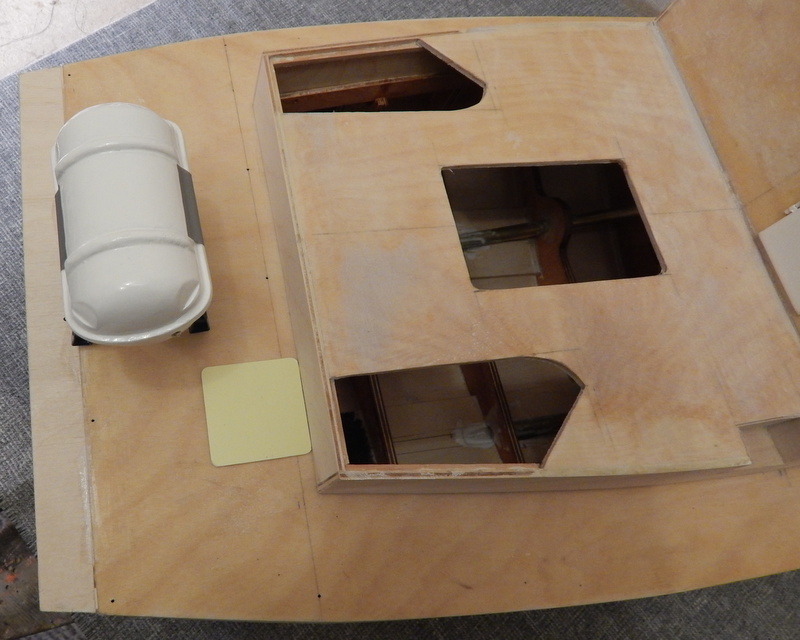 Na fotce widać dlaczego trzeba kadłub wyciągnąć ? Ten kwadrat to szablon włazu, który musi się zmieścić pomiędzy stojakiem tratwy a nadbudówką.