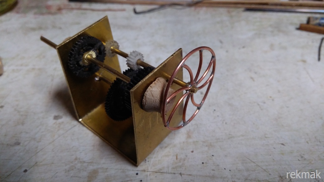 Szekla od kotwicy ma szerokość 4,0 więc oczko łańcucha chyba też powinno mieć szer. 4,0 mm. Przy windzie dużo zrobione. Trybiki z tego co miałem. Duże koło z drutu stalowego pokrytego miedzią z kabla antenowego TV. Brakuje kół pod łańcuchy i całość zmontować na dobre.