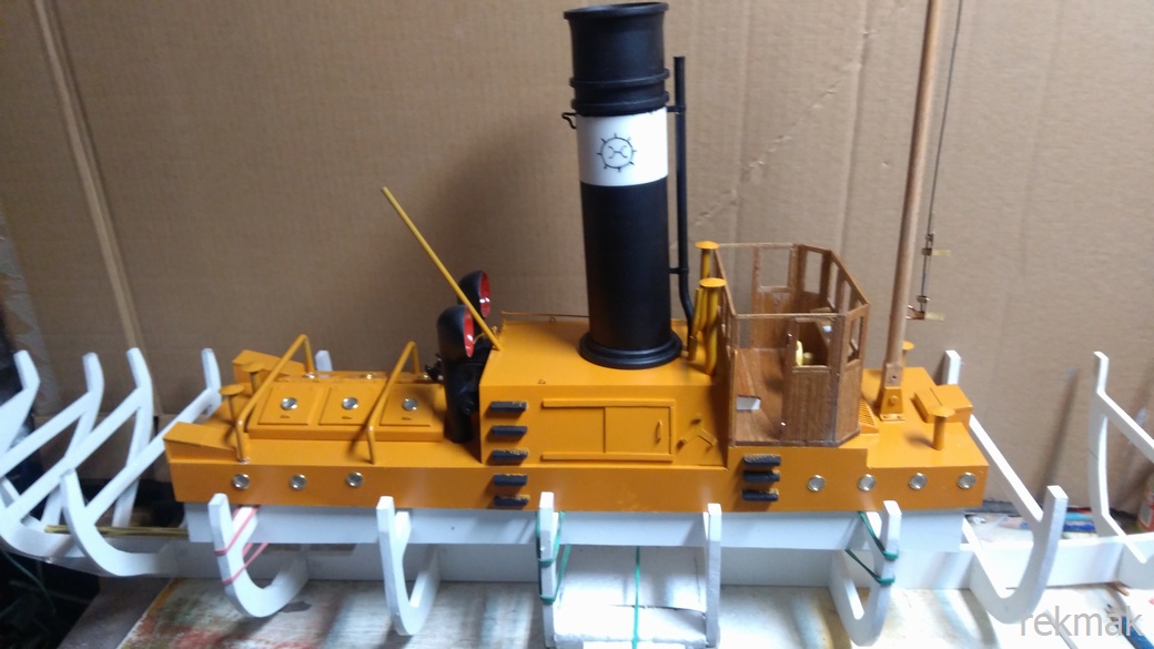 Wręgi ustawione. Nadbudówka pomalowana, bulaje wciśnięte. Przymiarka krzywizny nadbudówki z pokładem.