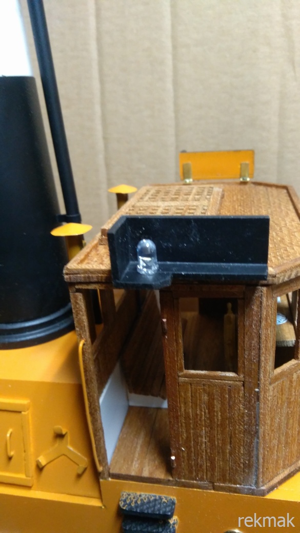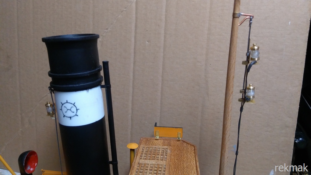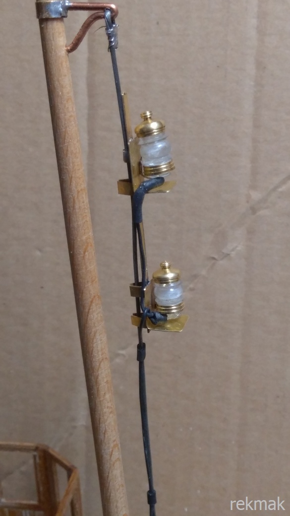 Po rozwierceniu otworów w lampach zamontowałem o podłączyłem na linkach stalowych przy maszcie i rufową przy kominie. Nie mam doświadczenia w tej sprawie.