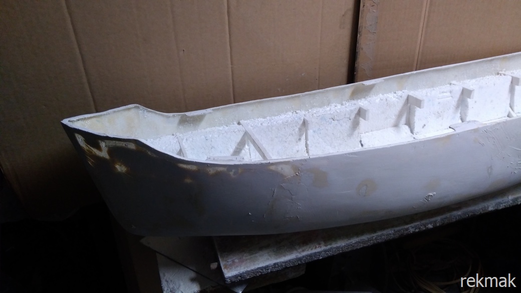 Obciąłem nadmiar laminatu robiąc kołnierz nadburcia i wydłubałem styropian do poziomu pokładu. Zlikwidowałem pęcherze robiąc nacięcie i po posmarowaniu klejem docisnąłem. Teraz w ruch pójdzie szpachlówka.