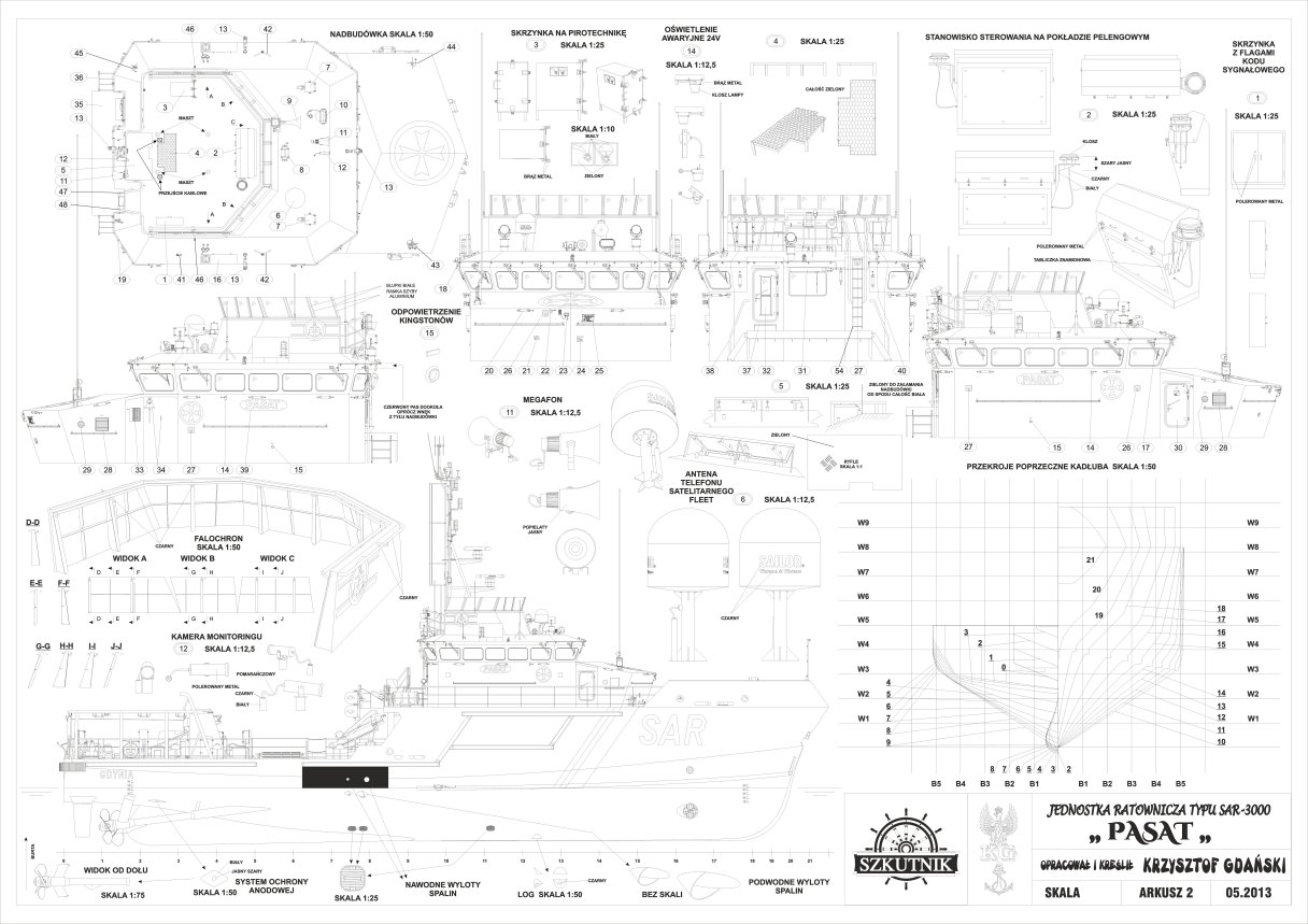 Zima nadchodzi wiec czas najwyższy zabrać się za nowy model , długo się zastanawiałem nad wyborem mam kilka ładnych planów modeli ale w końcu wybór padł na SAR3000 PASAT , plany kreślił Krzysiek Gdański i są one bardzo dokładne nakreślone , model będzie wykonany w Skali 1:36 , skala nie typowa jak na modele szkutnicze ale jak dla mnie optymalna model będzie miał 102,5cm długości i będzie wykonany jako nie pływający . Mam nadzieję ze jakoś podołam bo jednostka jest dosyć skomplikowana sam kadłub jak i cała reszta , a pokład usiany mnóstwem elementów , Krzysiek bardzo dokładnie nakreślił każdy szczególik do tego mnóstwo dokumentacji fotograficznej wiec będzie się na czym wzorować .