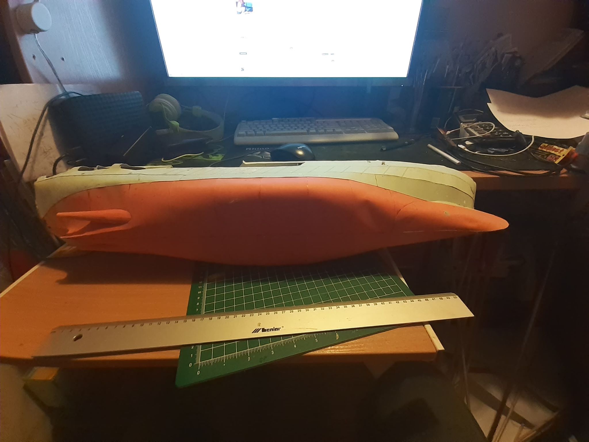 Jeśli chcesz kadłub na koniec zalaminować, to proponuję na pokrycie użyć spienionego PCV. Piorunem się klei cyjanoakrylami, dobrze szlifuje i jest elastyczne, co ułatwi poszywanie szkieletu.