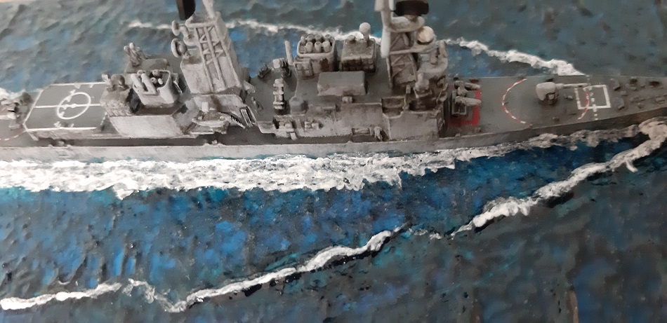 Ukończyłem budowe modelu wyżej wymienionego. Spasowanie bardzo dobre, klejenie czysta przyjemność (tamiya extra thin+revell contacta). Malowane było pierw podkładem w sprayu, potem bazowy pędzelkiem, lakier połysk w sprayu, kalki (tamka mark fit), połysk, wash, mat w sprayu wash do pokładu i na koniec znowu lakier matowy. Jako podstawkę posłużył mi odpad płyty wiórowej, oklejona balsą, by zamaskować strukturę płyty, przed malowaniem pokryłem górną część szpachlą do drewna. Do imitacji wody posłużyły mi farby akrylowe (modelarskie jak i dla plastyków) i efekty AK i still water vallejo. Z efektu jestem zadowolony choć jestem świadom, że dało się to zrobić lepiej. Ale biorąc pod uwagę, że jest to dopiero moja 2 dioramka morska w życiu i 3 plastikowy okręt z kolei myślę, że jest ładnie.