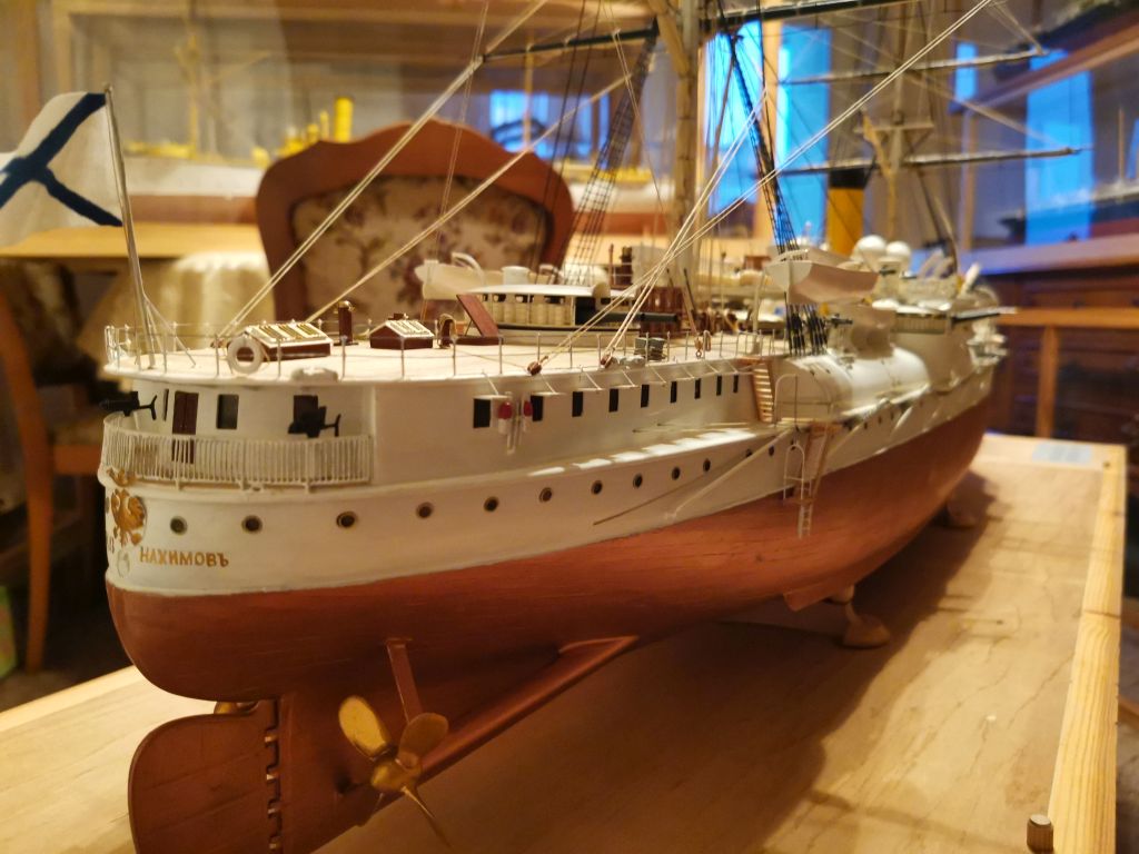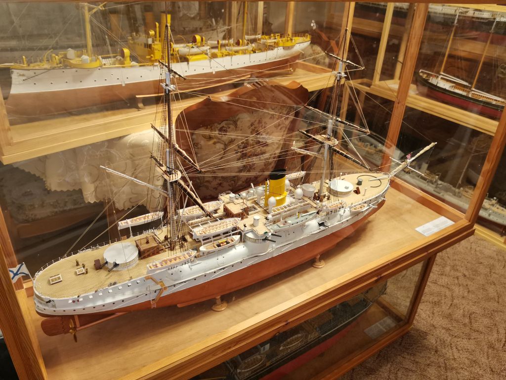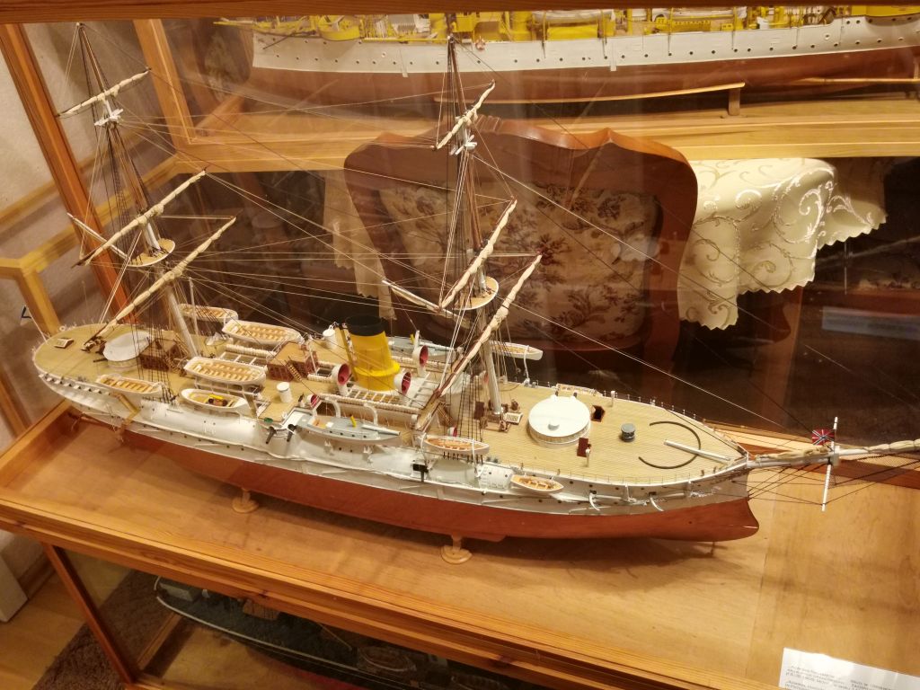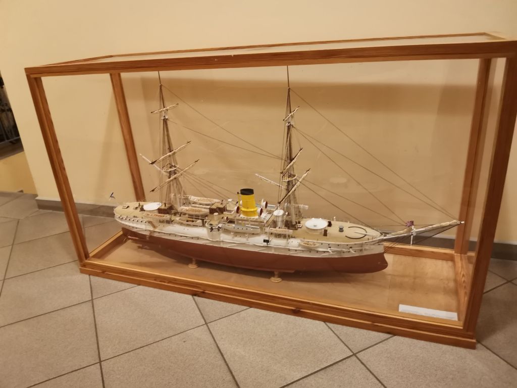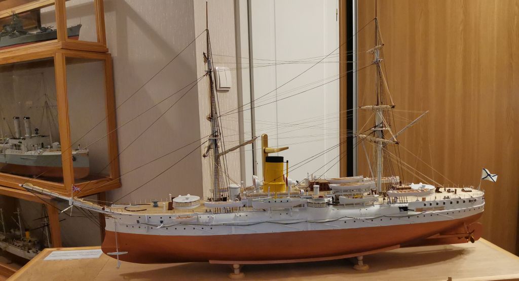 Krążownik opancerzony Admirał Nachimow 1/100 1888 wersja sprzed przebudów z żaglami. Powyżej w gablocie krązownik IV klasy SMS GEJER 1898 1/65