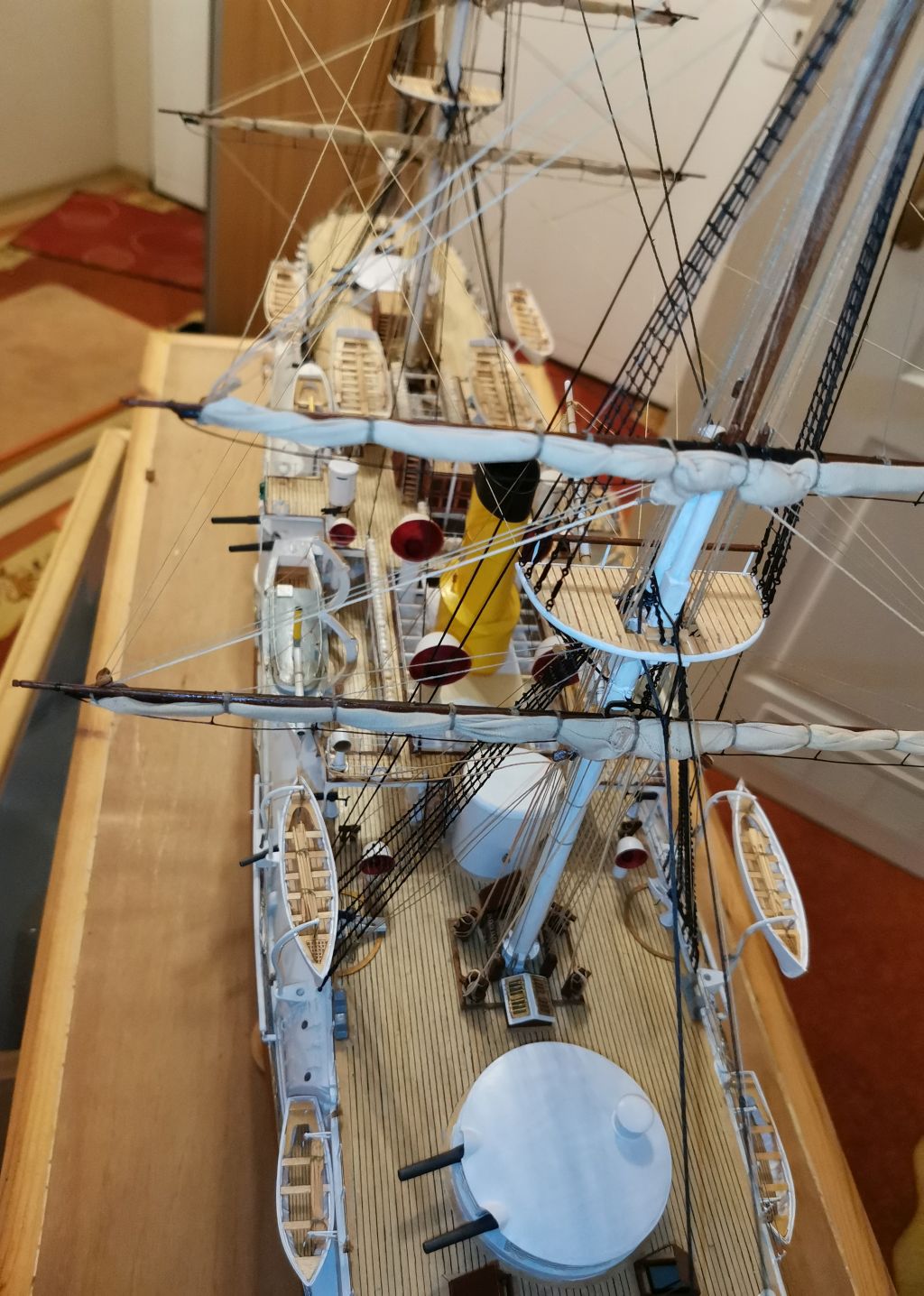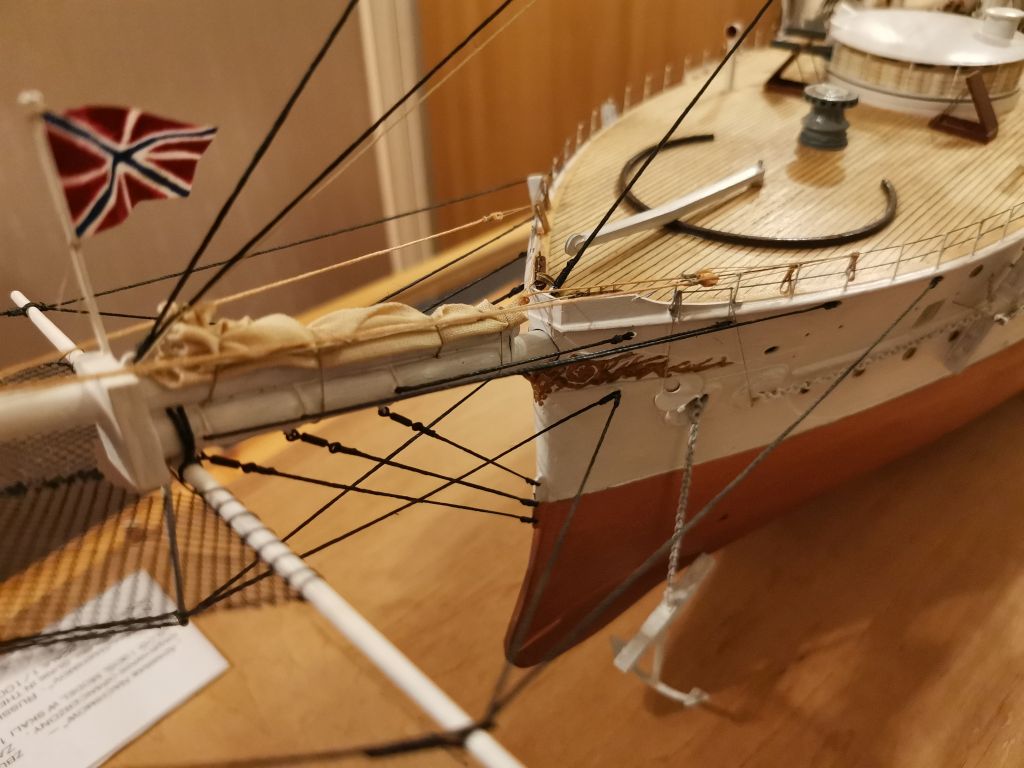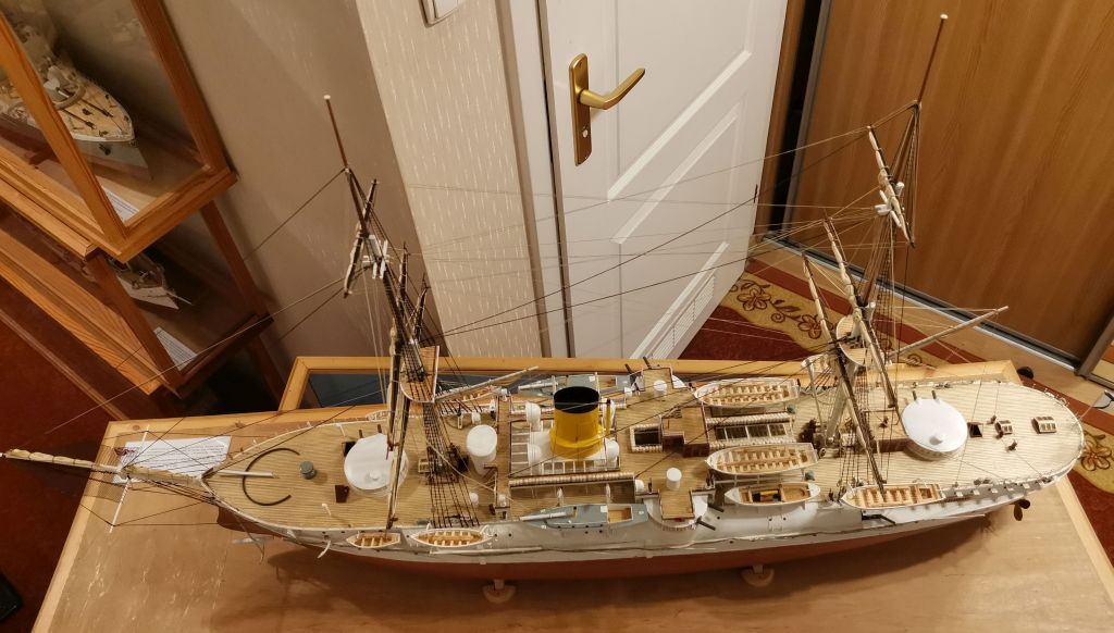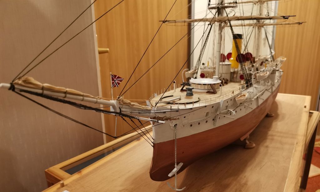 Krążownik opancerzony Admirał Nachimow 1/100 1888 wersja sprzed przebudów z żaglami. Powyżej w gablocie krązownik IV klasy SMS GEJER 1898 1/65