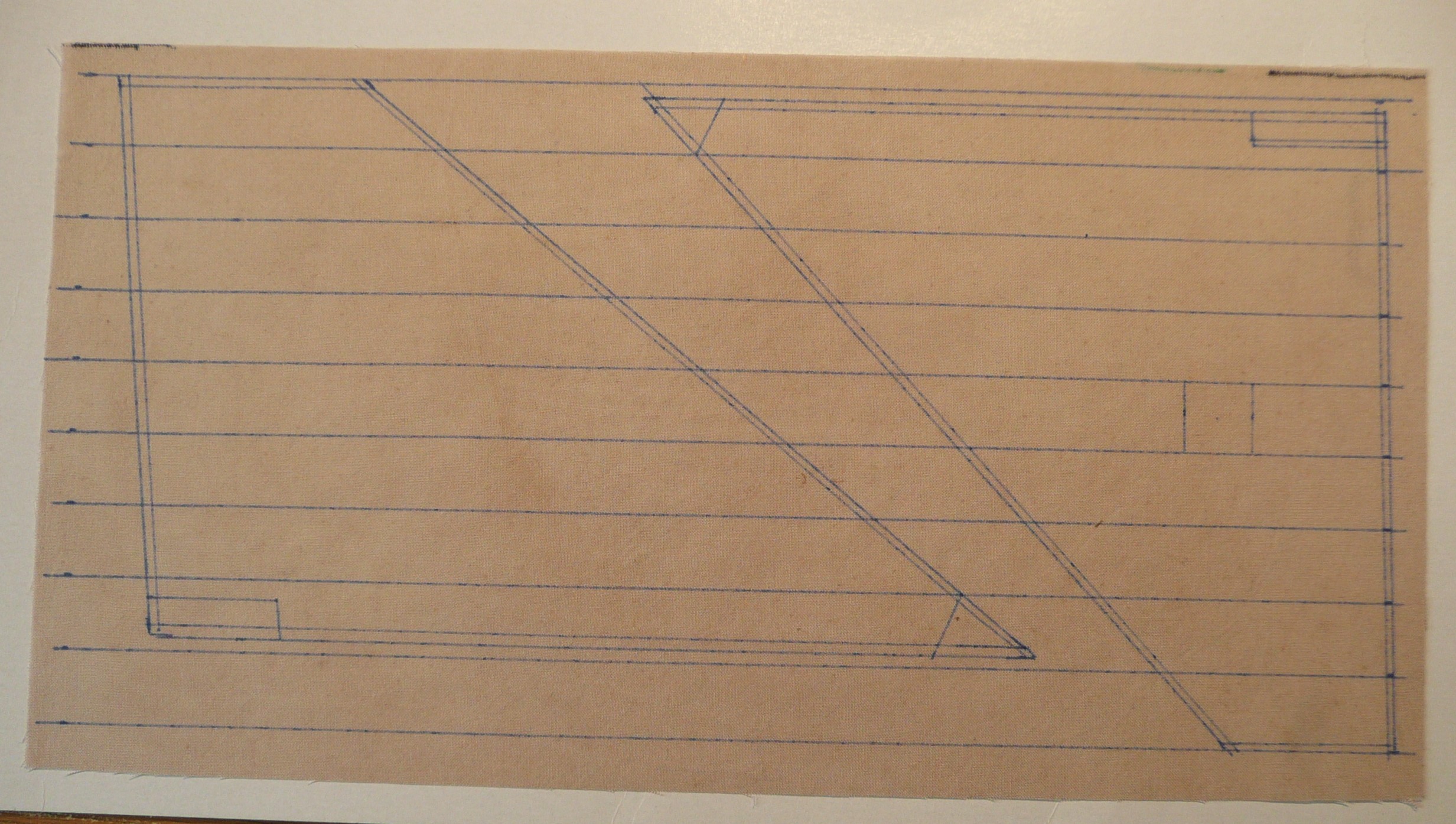 Płótno na żagle zostało namoczone w herbacie, a następnie nakrochmalone i przeprasowane. Na tak przygotowanym płótnie naniesiony został rysunek żagli przy użyciu pisaka ścieralnego. Wydawało mi się, że ścieranie tuszu odbywa się tak jak ścieranie śladu ołówka - ale tak nie jest. Tarcie gumką powoduje wydzielanie ciepła i to pod wpływem podwyższonej temperatury tusz przestaje być widoczny. Po włożeniu kartki do zamrażalnika tusz jest widoczny na nowo. (sprawdziłem! trwa to dosyć długo). Tak więc po przeszyciu brytów, tkaninę wystarczy przeprasować i rysunek znika. Muszę tylko pamiętać, że nie mogę z modelem wychodzić na mróz.