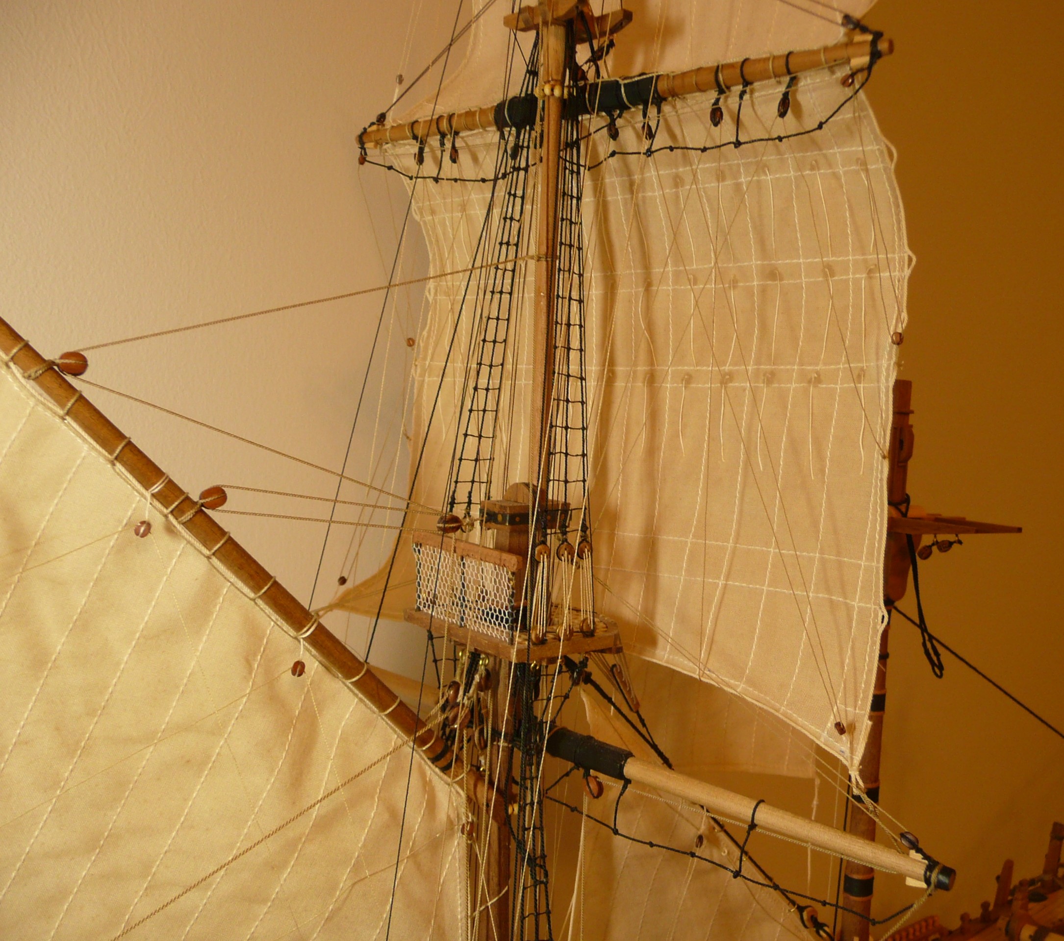 Przyjęta koncepcja wykonania w pierwszej kolejności pełnego olinowania i ożaglowania bezanmasztu, sprawdziła się. Zostały mi do wykonania brasy górnych reji i buliny mocowane do olinowania grotmasztu.