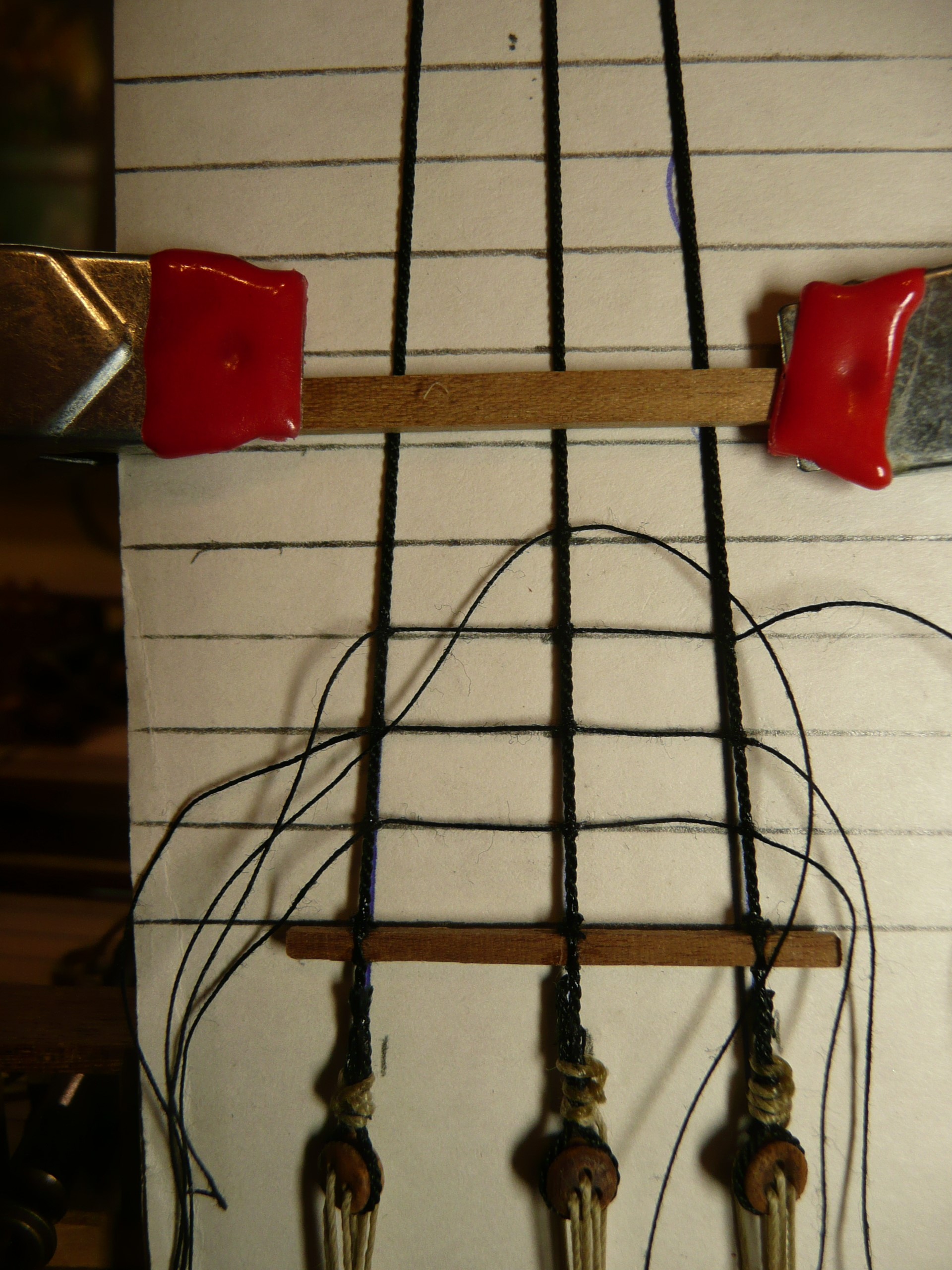 Polecam tez zrobienie sobie z duzych igiel zamocowanych na przedluzkach drewnianych (trzonki od np. starych pedzelkow), kilku narzedzi do wiazania linek, jak na zalaczniku - sa one niezastapione w tej pracy i ulatwiaja dojscie w glab kadluba, w ta "pajeczyne" linek.