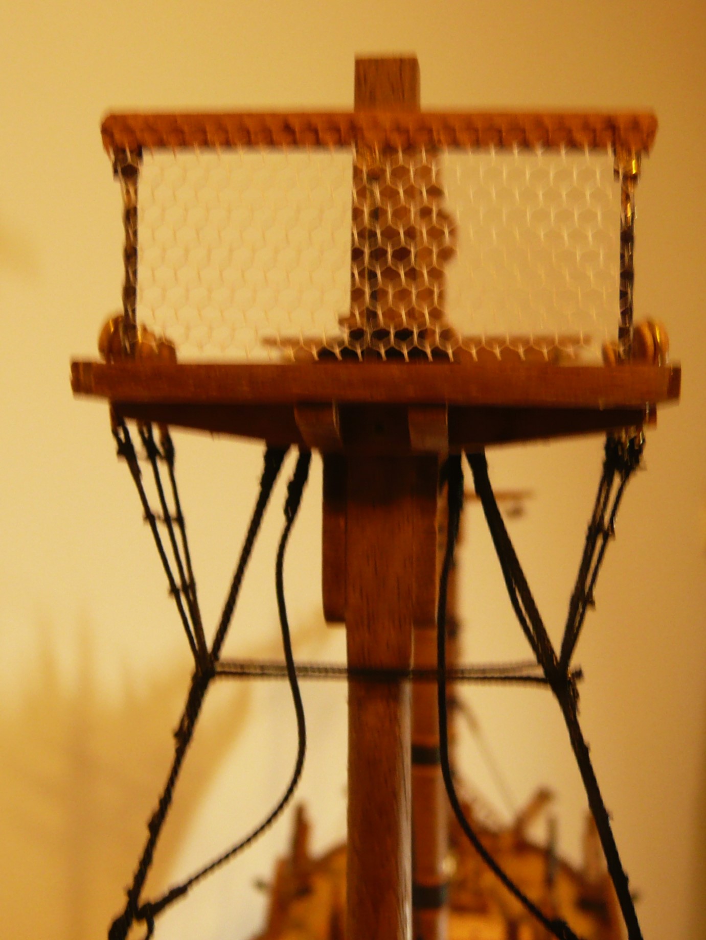 Patrząc na olinowanie, łatwo zauważyć, że większość lin jest prowadzona do pokładu lub burt i skierowana w stronę rufy (wanty, szoty, brasy itd). W końcu maszyną napędową żaglowca są żagle - tak ustawione, aby ciągnęły statek do przodu. Liny kompensujące parcie wiatru na żagle, będą więc skierowane przeciwnie - w kierunku rufy. Wydaje mi się, że dostępność punktów mocowania lin będzie ułatwiona, jeżeli pracę przy takielunku rozpocznie się od strony rufy. Po wklejeniu na stałe kolumn wszystkich masztów, olinowanie i ożaglowanie zacznę od bezanmasztu.