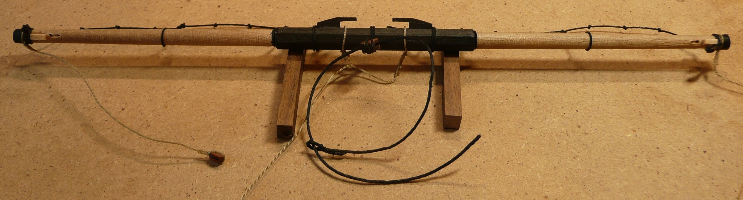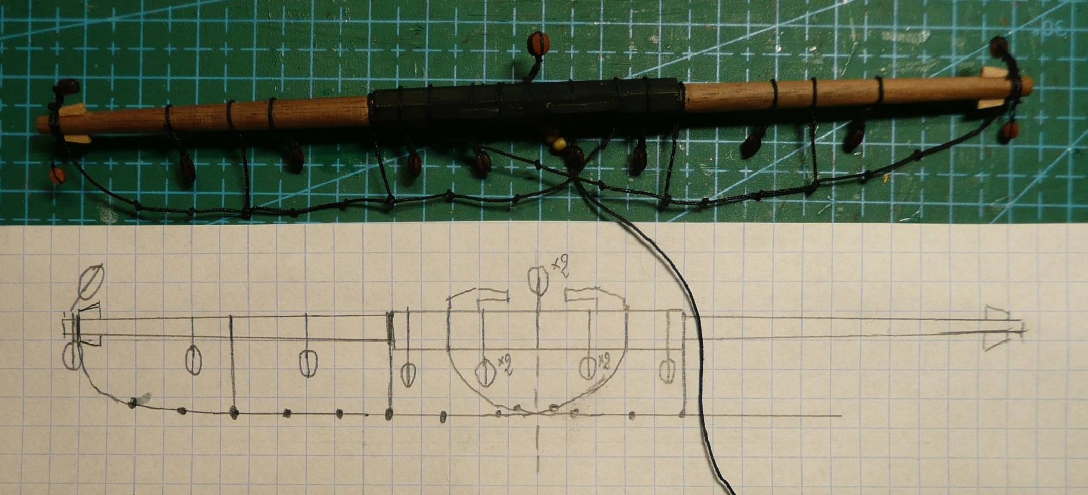 Przyjęta koncepcja wykonania w pierwszej kolejności pełnego olinowania i ożaglowania bezanmasztu, sprawdziła się. Zostały mi do wykonania brasy górnych reji i buliny mocowane do olinowania grotmasztu.