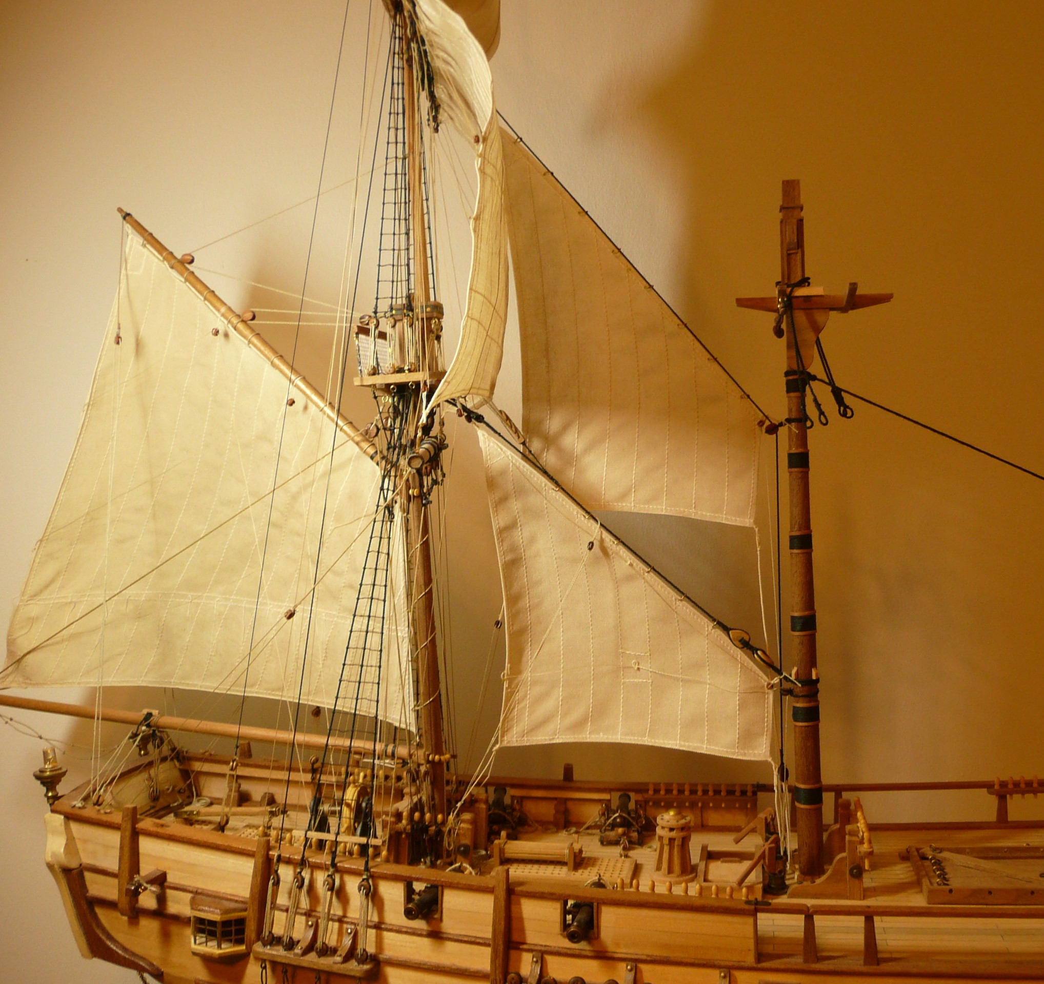 Żagle zostały uszyte z batystu zakupionego za niewielkie pieniądze w zwykłym sklepie tekstylnym - jeszcze do budowy poprzedniego modelu "Santa Maria" https://www.koga.net.pl/forum/7/47615.html?start=20
