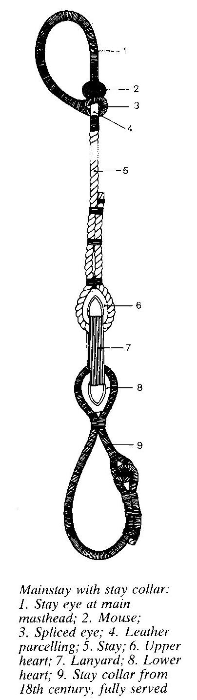 Położenie myszki (poz.2 na rysunku) powinno być tak dobrane, aby pętla kończyła się równo z salingiem. Jeżeli sztag był mocowany przed fokmasztem, to powinien mijać maszt po sterburcie, a maszt należy zabezpieczyć przed wycieraniem.