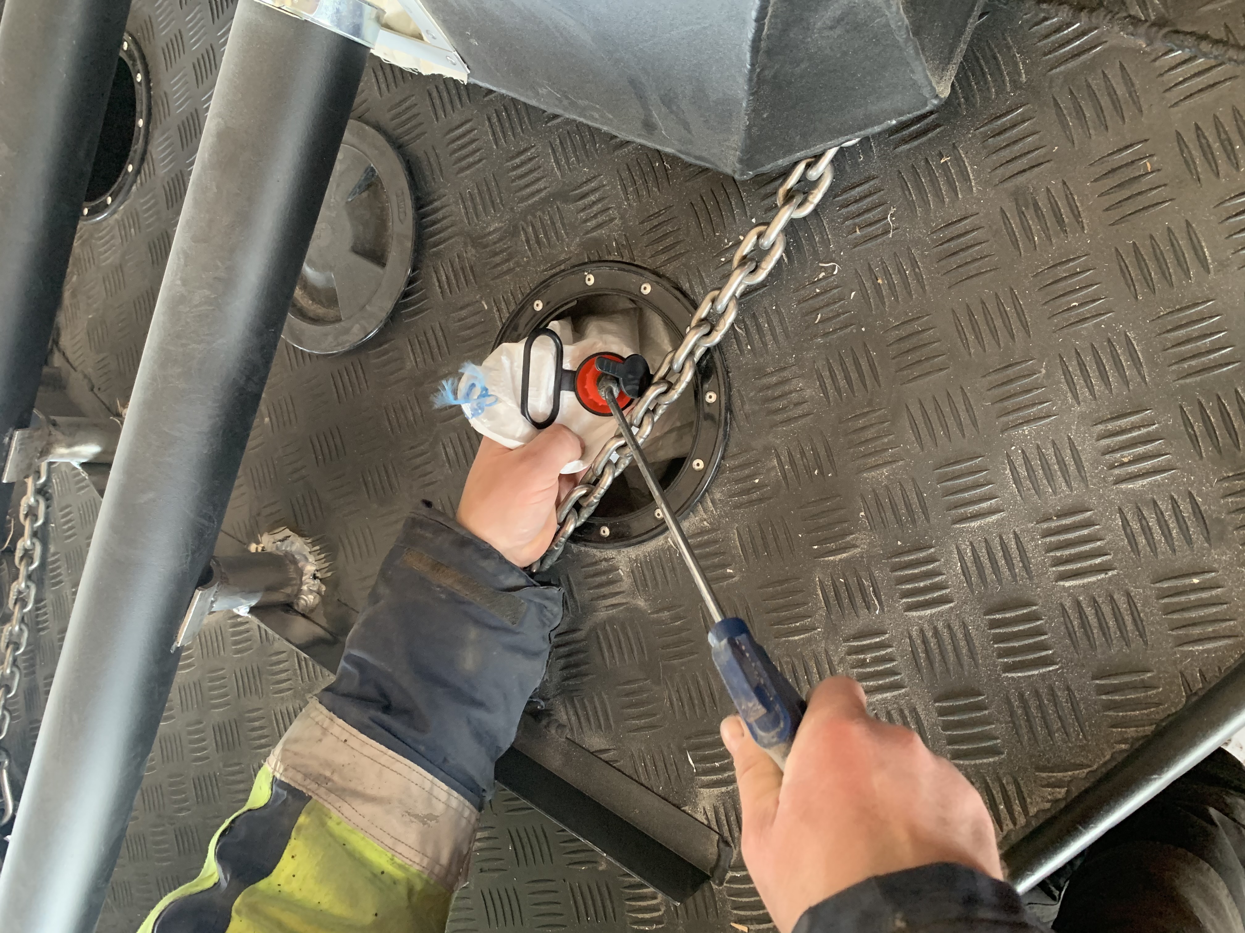 Na fotkach wyżej widać luk rewizyjny przedniej komory dziobowej jako zbiornik wypornościowy Tam zostały wstawione worki sztauerskie i napompowane do 1,5 Atmosfery Aż kadłub jęczał Potem wystarczyło zakręcić pokrywę luku a było to niełatwe Trzeba było użyć bloków i dźwigni ale poszło . co to daje w praktyce ? Burta zachowuje się jak opona w tirze ale zamiast gumy jest kadłub z aluminium . Nawet gdyby doszło do jej przebicia to zaledwie jeden z pięciu worków byłby uszkodzony a to sporo za mało by zagrozić zatonięciem . Takich komór jest 13 na jednostce