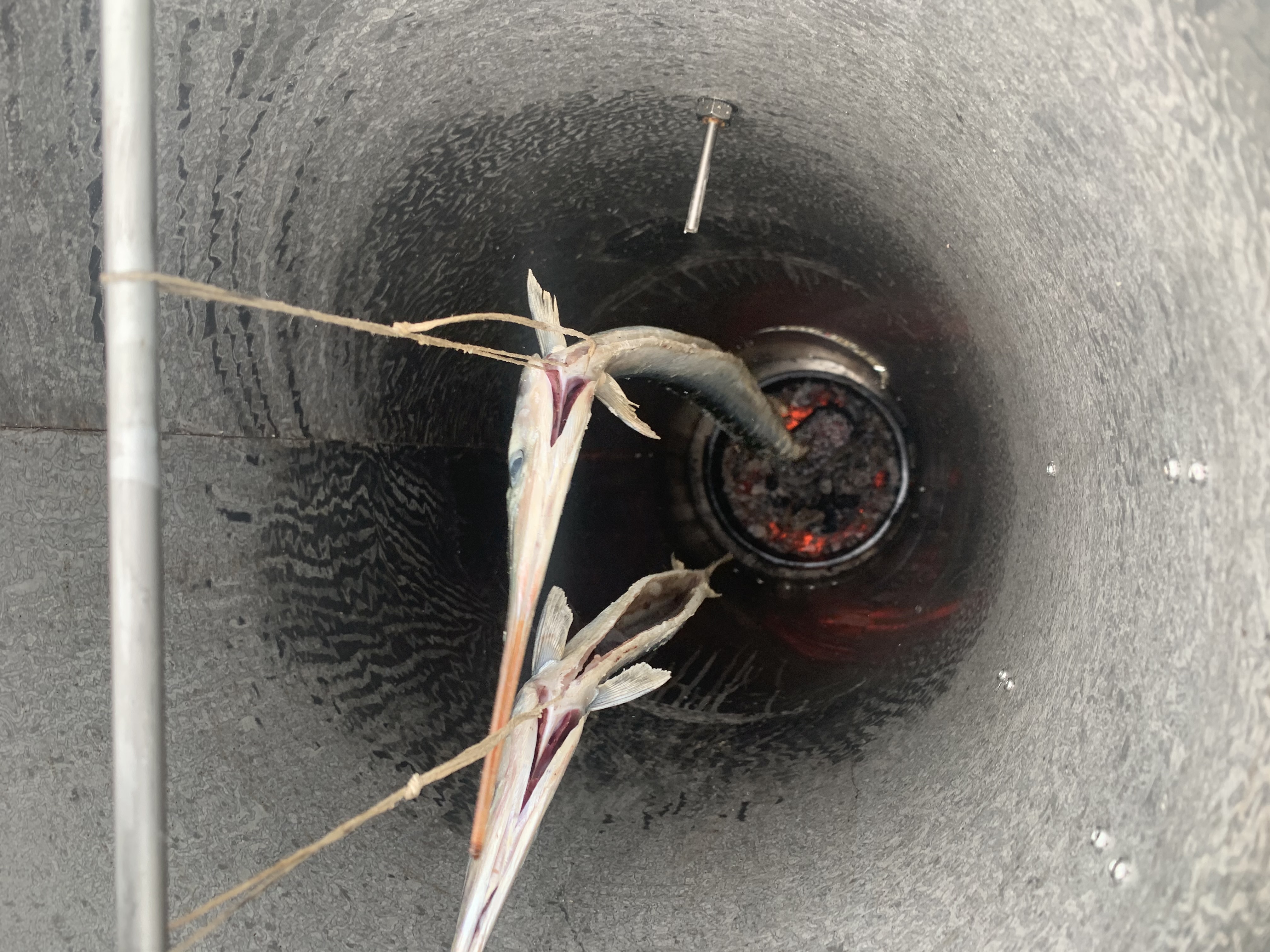 Te ostatnie fotki to grill i wędzarnia a leci to tak jak tylko odbijamy od pomostu rozpala się grill w kominie i kładziemy kiełbaski a ja steruję Pancernikiem a reszta wyrzuca wędki na troling czekając na branie Belony . Potem zjadamy te kiełbaski i jak mamy farta to pierwsze cztery belony wypatroszone trafiają do komina i je wędzimy a jak mamy pecha to mamy szczęście bo zabieram ze sobą zapeklowane boczki i schab oraz karkówkę i już na koniec podróży przy pomoście gorąca degustacja mięsiwa . Uwierzcie turyści aż pękają z zazdrości a Ci z plastykowych jachtów też .