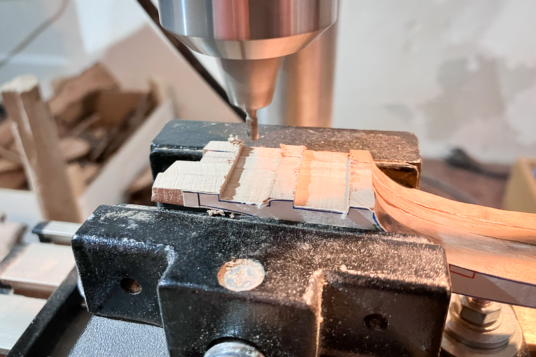 Część nacięć zrobiłem na frezarce, jednak potem zauważyłem, w sumie szybciej naciąc piłą i pilnikem wyczyścić. Ustawianie drewna w imadle i samej maszyny trwa dłużej niż samo nacięcie piłą.