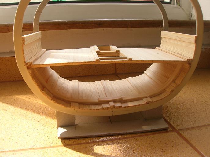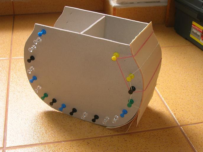 Przygodę zacząłem od próby budowy skorupy z forniru doklejając każda następną warstwę do siebie i muszę przyznać ze szlo to dobrze ale tyko do 4 warstwy , każdy kolejny płat ściągał cały kadłub do siebie. no i po sklejeniu 8 warstw model jak czarna dziura zapadł sie w sobie i zrobiła sie z tego ciekawa rzeźba , a ponieważ "ze sztuką mi nie do twarzy" więc wszytko wylądowało w koszu.
