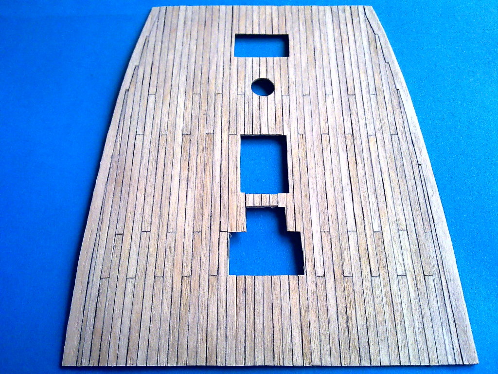 Pokład śródokręcia wyszedł nieco jaśniejszy, niż pozostałe, a był robiony z brzozy tak jak inne pokłady. Nie wygląda to źle, ale na przyszłość muszę bardziej uważać.[/attachment]