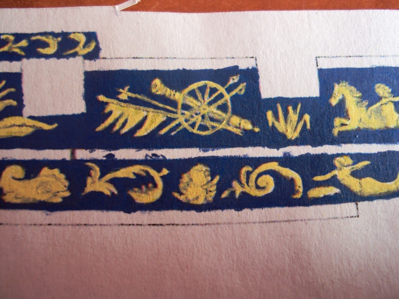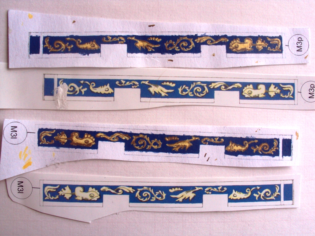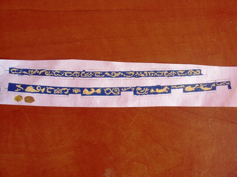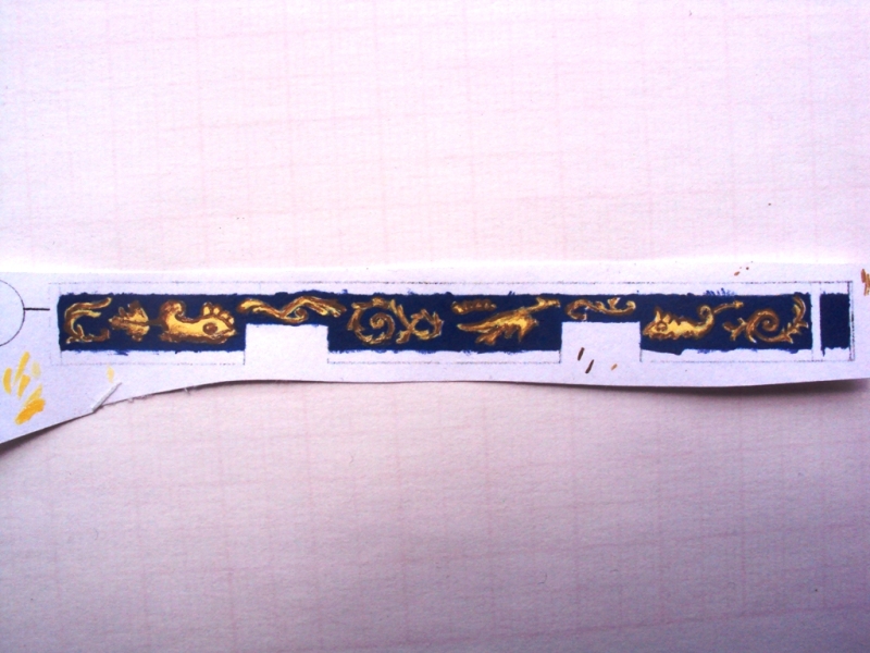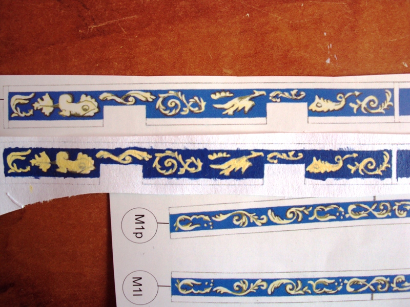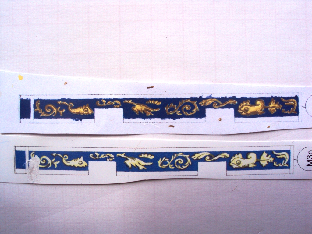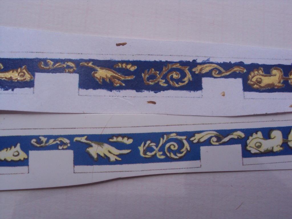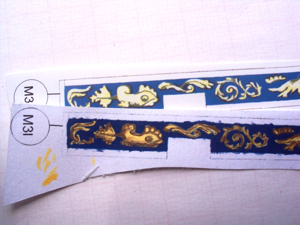 Postanowiłem zmienić drukowane malowidła na malowane o ile się uda. Na razie pomalowałem tło, zostawiając wzory drukowane ( nawet w tym zestawieniu lepiej to wygląda). Wzory będa malowane później, ponieważ przy malowaniu tła nieraz farbka najedzie na wzór. Używam pędza z oznaczeniem 1 - bardzo cienki.