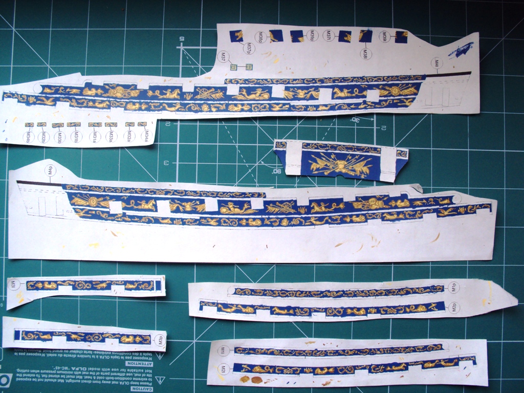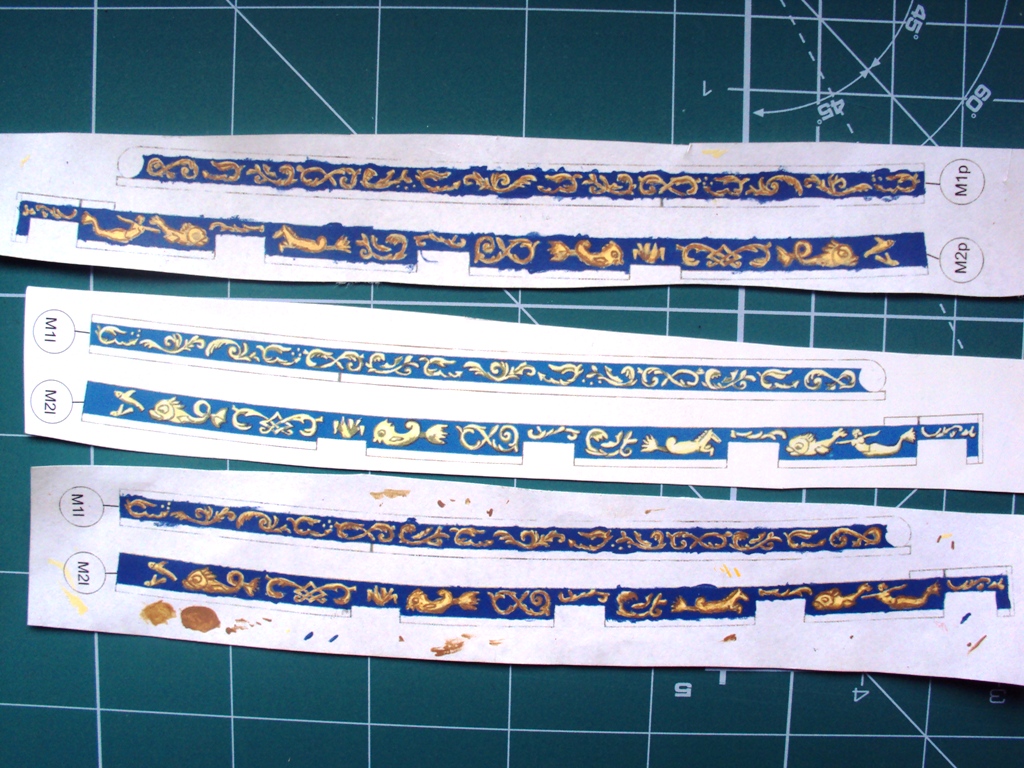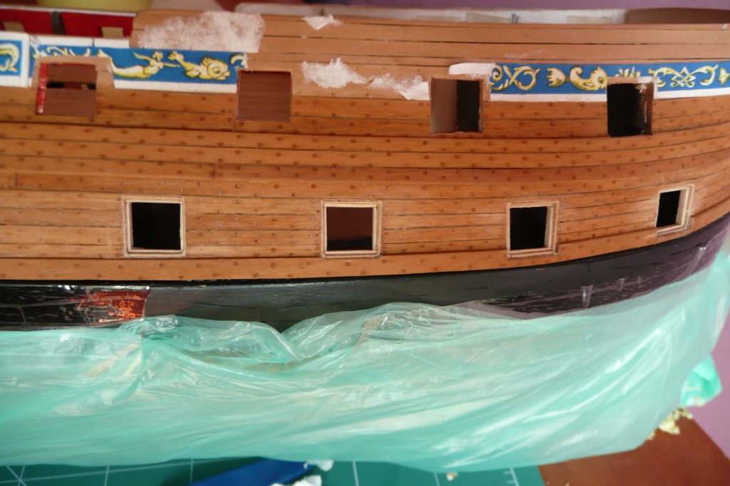 Remontowania ciąg dalszy. Poprawiłem ambrazury na najniższym pokładzie bateryjnym. Nie miałem w planach poprawy ambrazur na wyższym pokładzie, ale po namyśle doszedłem do wniosku, że również blado one wypadają, zwłaszcza przy poprawionych niżej otworach. Tak więc przystąpiłem do dzieła. Tak wyglądają otwory poprawione i te zaczęte. W zapomnienie poszły również drukowane malowidła: