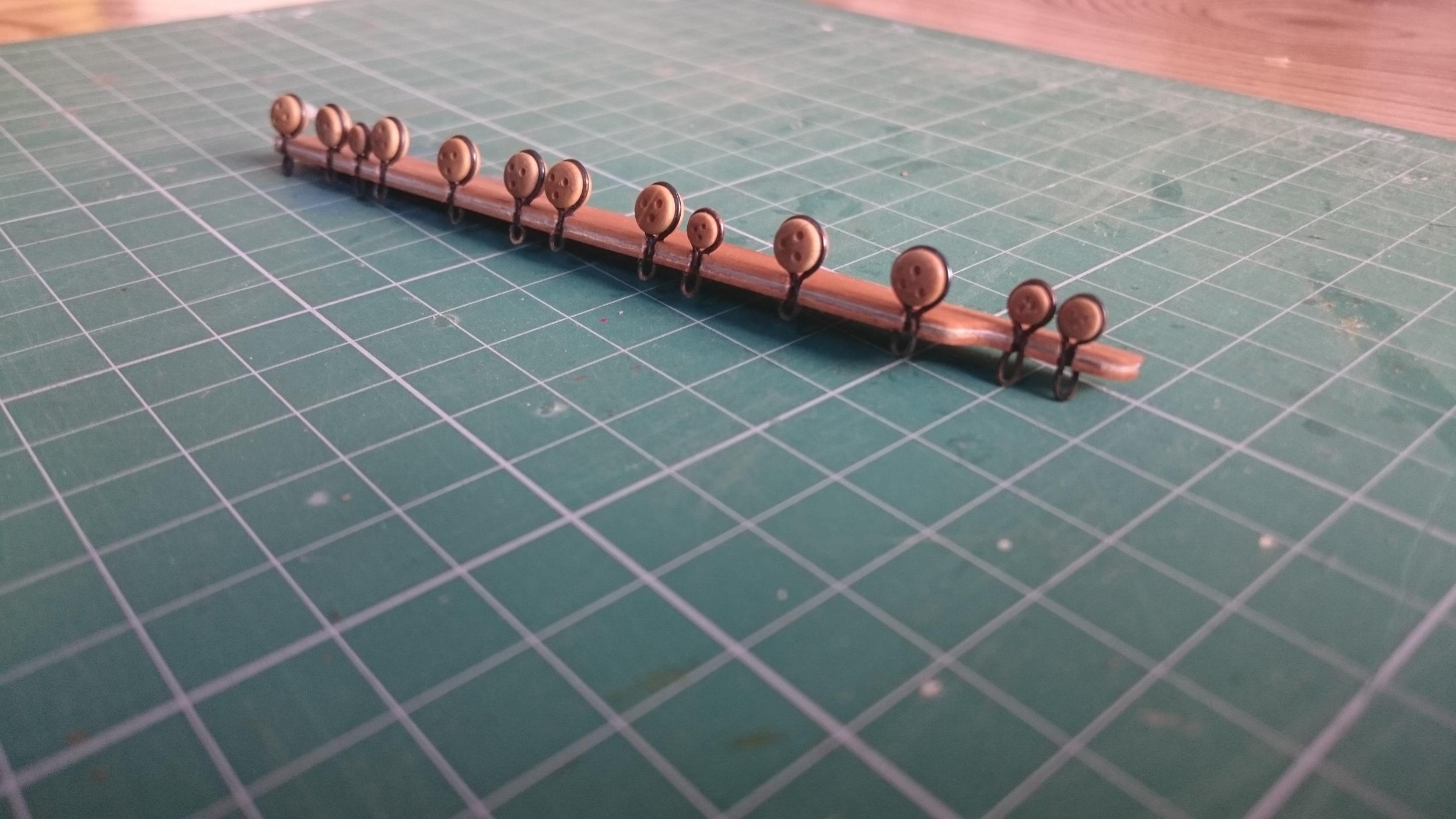 Zawiasy wykonuję sam, ponieważ zaproponowane przez Shipyard się nie nadają do niczego. Wykonuję je z izolacji drutu, papieru i drutu mosiężnego 0,3 mm. Całość malowane mieszanką farb humbrola - ta sama co armaty.