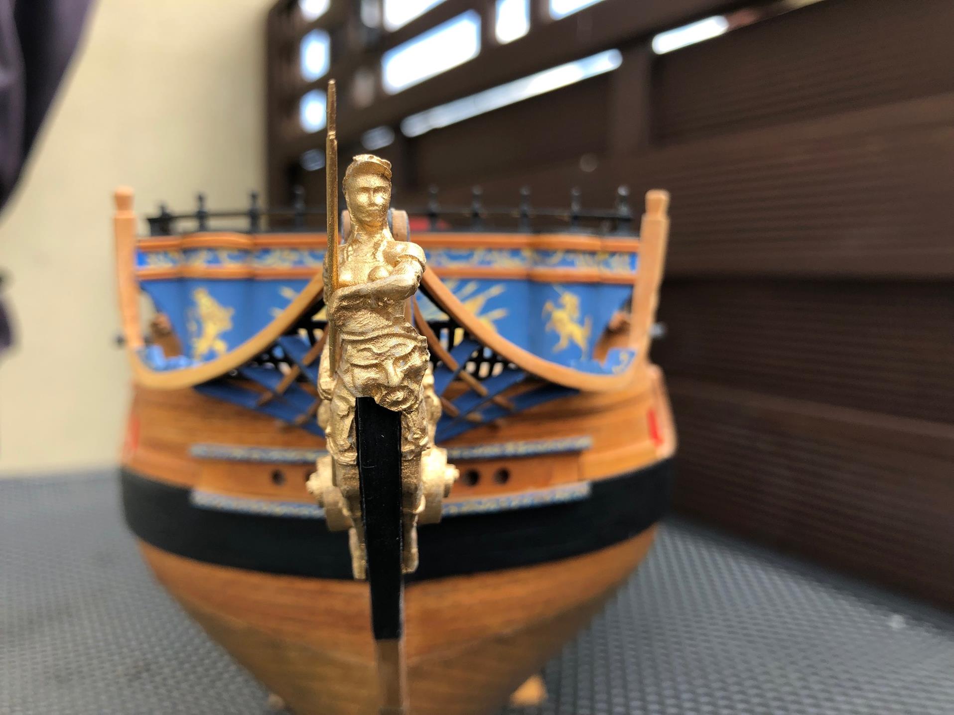 Prace przeniosły się na dziób okrętu. Doszła rzeźba. Paniusia włócznie ma wyjmowaną, bo pewnie nie raz by się złamała do końca budowy.