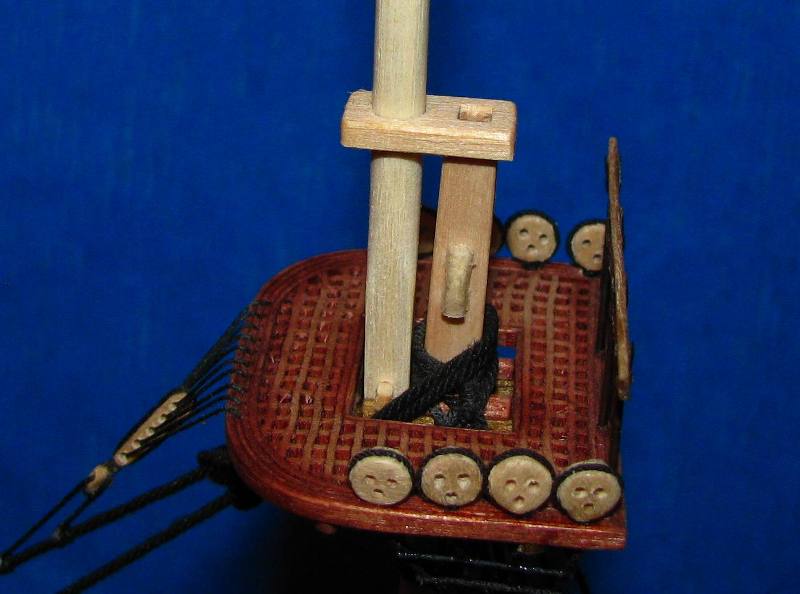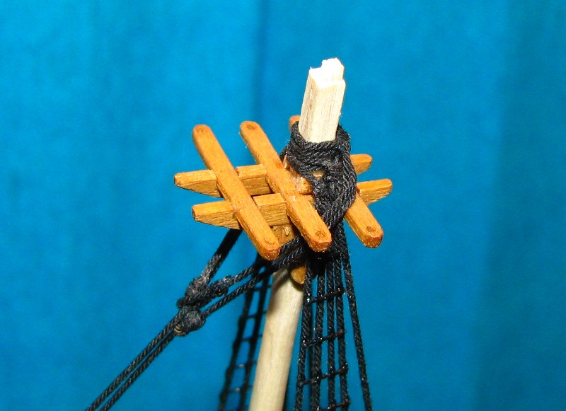 Sztagi stengi 0,5 mm. Zakończenie sztagów w kształcie kółka zrobiłem tak: zawiązałem ciasno linkę sztagu wokół drutu, zawiązałem końcówkę i całość mocno nasączyłem superglutem. Po zsunięciu z drutu całość trzyma kształt a nitka oplotu ładnie układa się w środku.