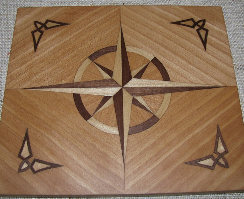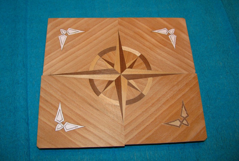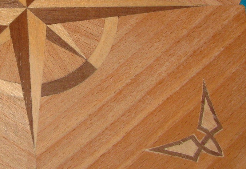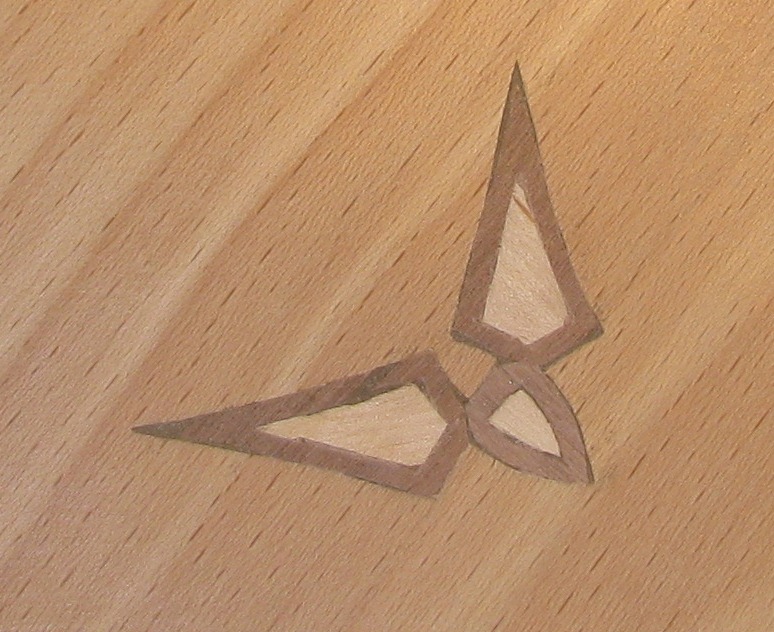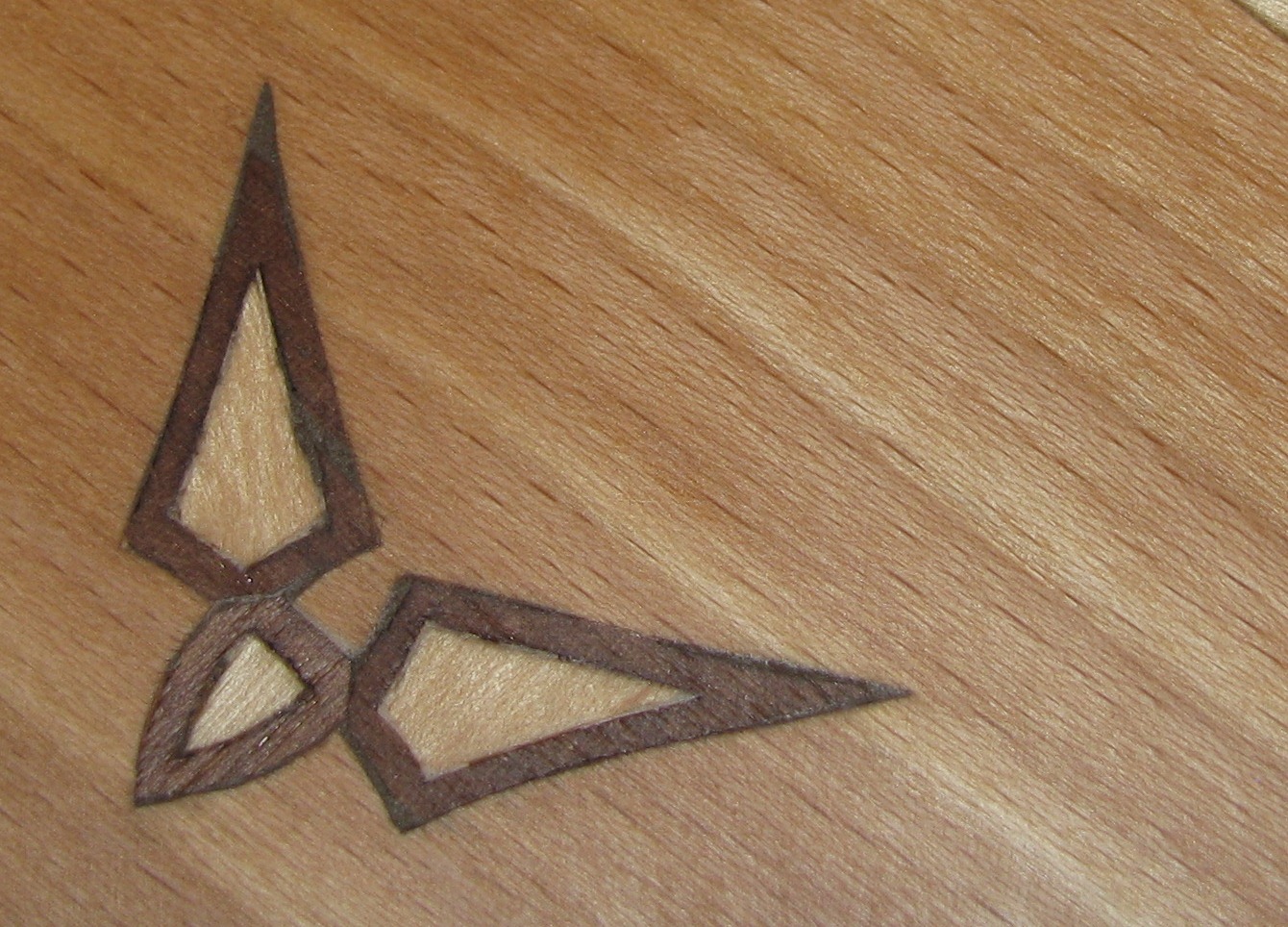 A tak to robiłem – na sklejce rozrysowałem docelowy wzór. Na fornir naklejałem wydrukowane elementy wzoru i wycinałem nożem łamanym. Potem butaprenem po kolei przyklejałem docinane kawałki forniru do sklejki.
