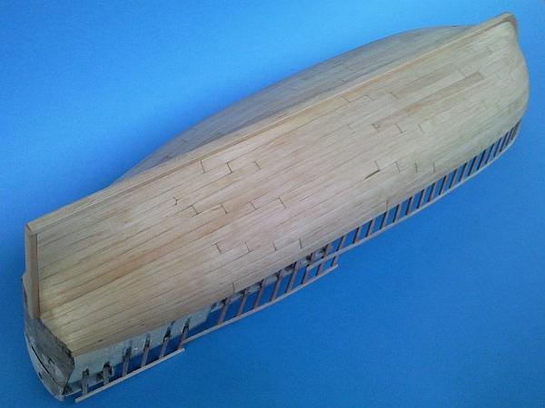 Po dokończeniu prac nad stępką i dokładnym wyszlifowaniu poszycia zabezpieczę je pokostem, po czym zrobię podstawkę do modelu.