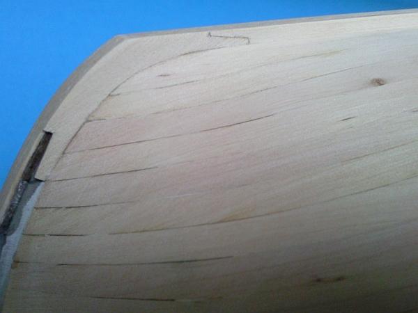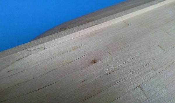Gdy dało się to już obrabiać doszlifowałem wszystko do wymaganego kształtu, po czym na całej długości, oraz od strony dziobu nakleiłem paski forniru o szerokości 5 mm. Dzięki temu otrzymałem to, co zobrazowałem wcześniej na rysunku, co widać również na poniższym zdjęciu: