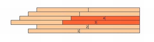 Kolejna koncepcja pojawiła się, jak olśnienie. Poszycie na Pince wykonałem, nieudolnie wzorując się na książce Monfelda (str. 95) i jest ono zrobione z listew ułożonych w fazach po cztery. Problem w tym, że mój kłopot dotyczy najdłuższych listew w danej fazie i ich wycięcie byłoby bardzo ryzykowne, zwłaszcza, że ich końce są świetnie "zazębione" przy sąsiednich listwach. Dlatego, korzystając z tego, że są takie długie, wymyśliłem, że przetnę je zgodnie z przebiegiem poprzedniej fazy, imitując jej kontynuację (na zdj. i rys. oznaczone 3 i 4). Dzięki temu nie będę musiał wycinać całych listew, a kadłub może ocaleć przed konsekwencjami mojego braku doświadczenia. Na drugiej burcie zaznaczę to delikatnie nożykiem i przetrę szmatką lekko nasączoną pokostem.