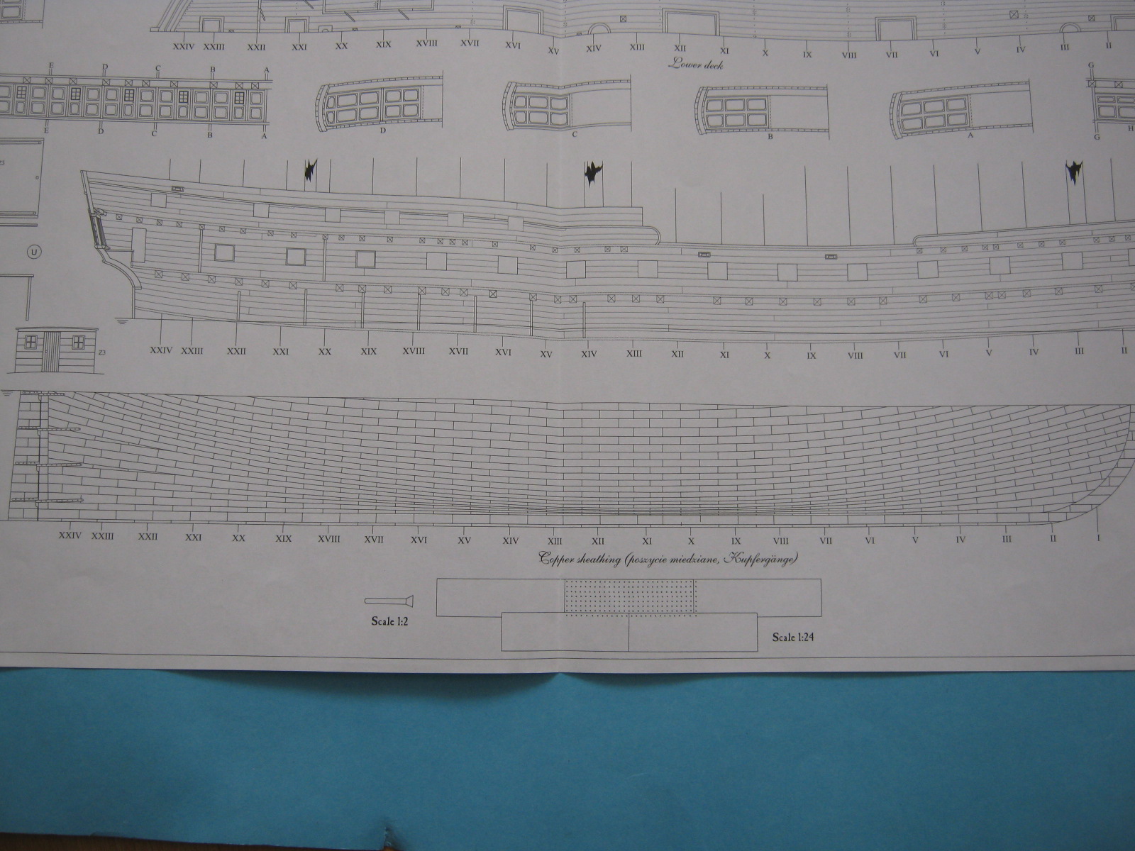 Wybrałem tą drugą opcję, chociaż w pierwszej widać więcej "żywego" drewna i troszkę szkoda je zamalować ale druga wersja po prostu mi się bardziej podoba. Poza tym dochodzi wyzwanie miedziowania. I tutaj od razu widzę problem. Na planach blachy pokazane są tak, że dolne blachy mają przykrywać górne czyli, że miedziowanie należy zacząć od linii wodnej do stępki.
