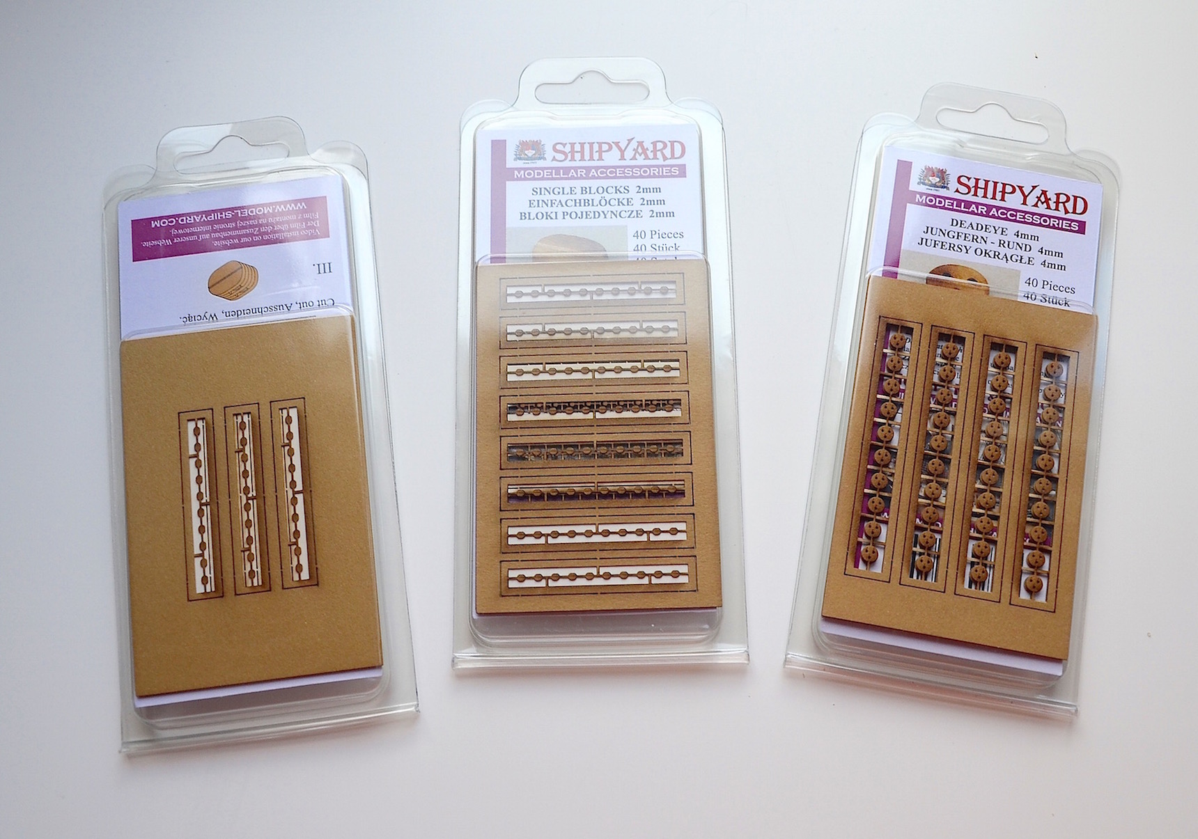 Nabyłem ostatnio, celem przetestowania, laserowo cięte bloczki z wydawnictwa Shipyard. Zakupiłem bloki pojedyncze i podwójne o długości 2 mm oraz jufersy o średnicy 4 mm.
