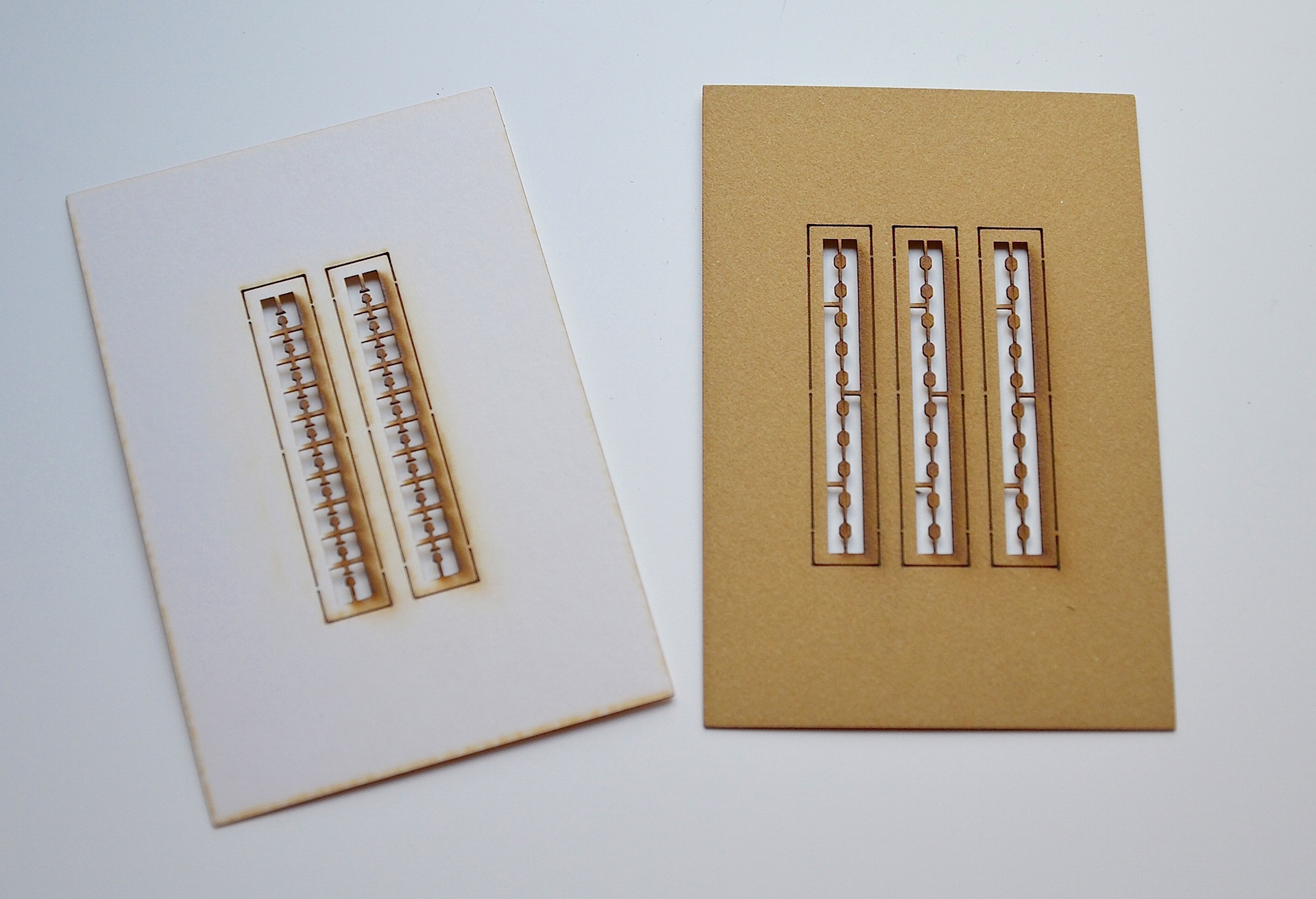 Policzki bloków zostały również z jednej strony lekko przydymione brązową farbą (nie jest to efekt cięcia laserem) a w związku z tym, trzeba uważać przy ich klejeniu, aby przyciemniony fragment bloku znajdował się po tej samej stronie.