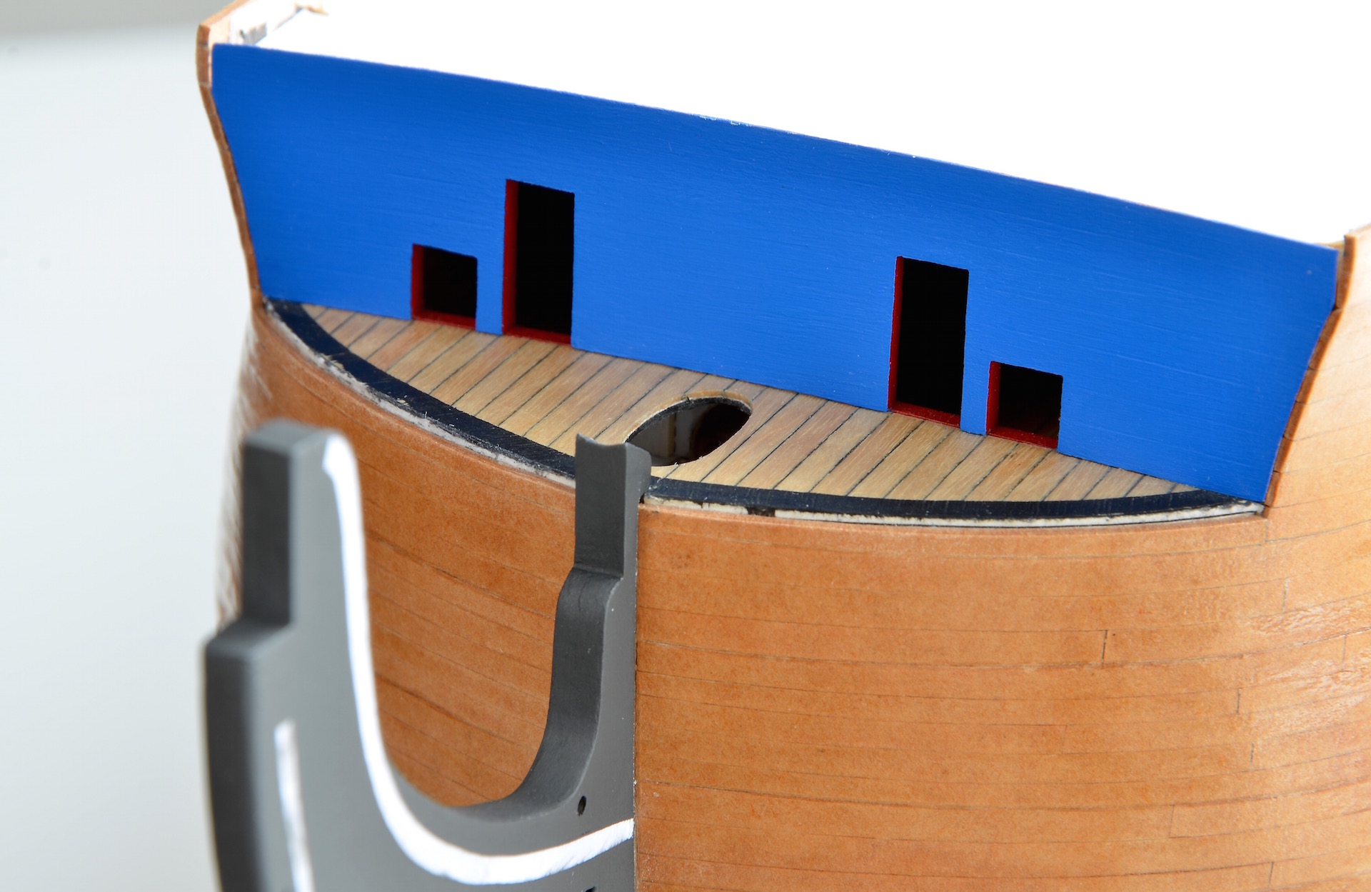 Tym razem stewa została wykonana z szarej tektury, a nie z preszpanu bo przy takiej jej grubości (4 mm) obróbka preszpanu byłaby bardzo trudna. W ramach inwencji własnej, w stewie dziobowej wykonałem otwory na łącznik (przewiąz) bukszprytu oraz otwory na watersztagi. Otwory te nie były zaznaczone w oryginalnym elemencie wycinanki, nie wiedzieć czemu.