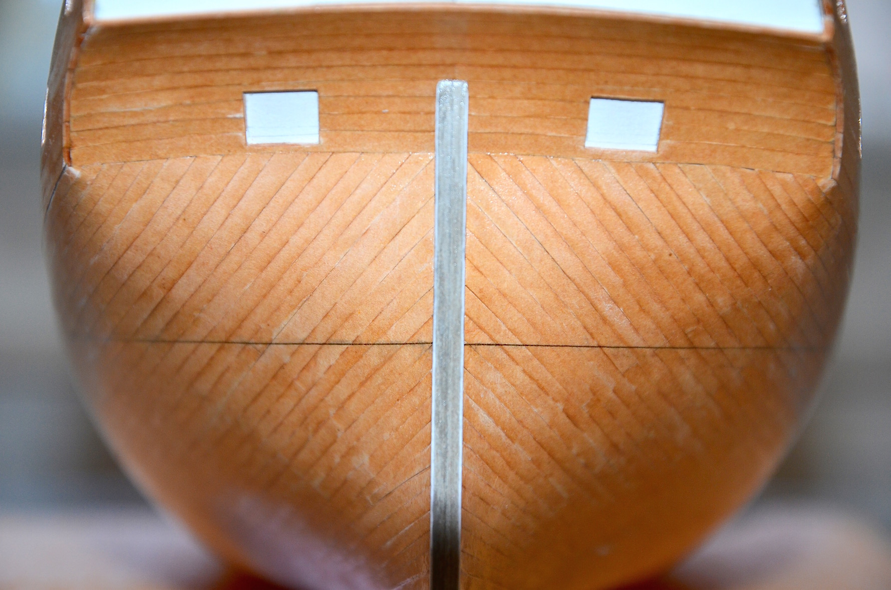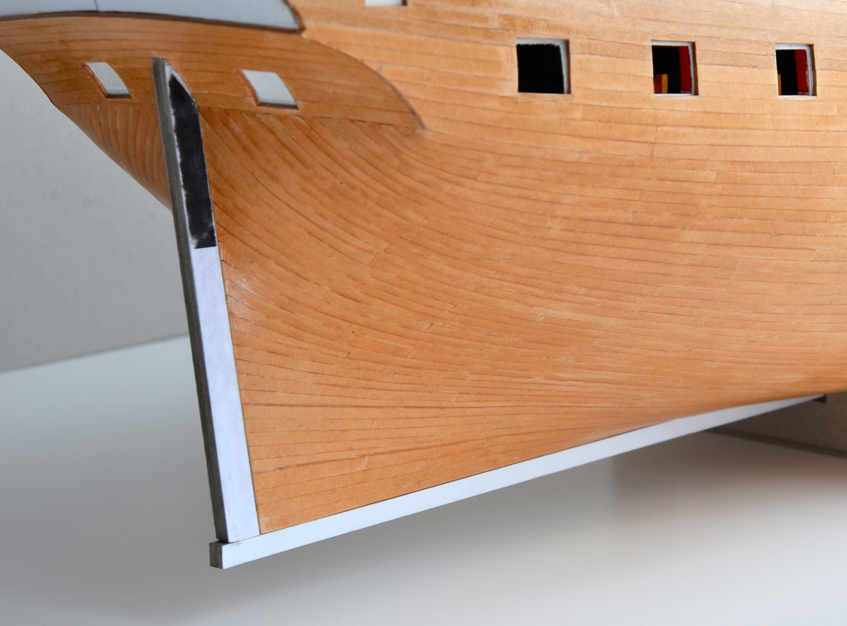 No i powstała stewa dziobowa, rufowa oraz kil, elementy niezbędne przed kolejnym etapem prac tj. miedziowaniem. Niestety osiągnięty przez mnie efekt nie jest satysfakcjonujący (względnie zadowolony jestem jedynie z wyprofilowania łoża na bukszpryt). Pomimo szlifowania i pasowania na połączeniu stewy dziobowej z bryłą kadłuba powstały widoczne szpary. Jedyna pociecha w tym, że większość tych krawędzi zostanie przykryta miedzianym poszyciem oraz stykającymi się ze stewą pasami stanowiącymi wzmocnienie nadburcia.