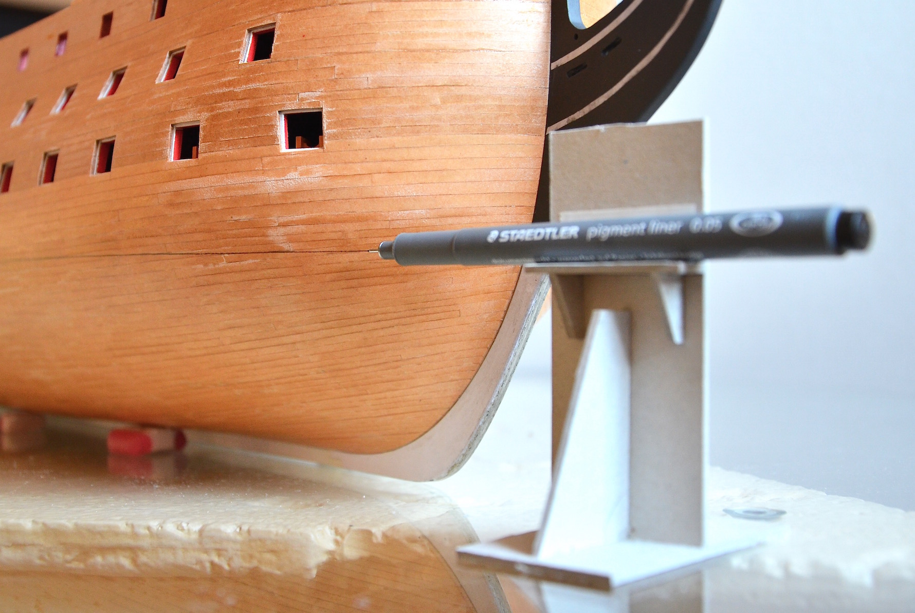 Przed rozpoczęciem miedziowania, za pomocą wysoce specjalistycznego narzędzia , wyznaczyłem przebieg linii wodnej, stanowiący jednocześnie granicę dla miedzianych płyt.