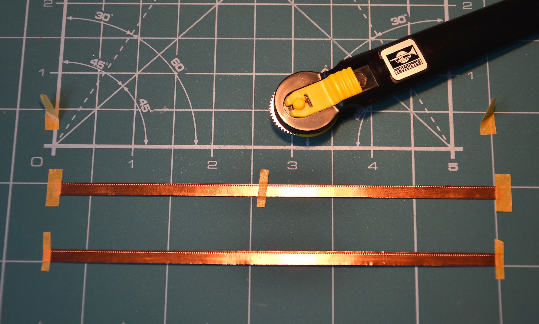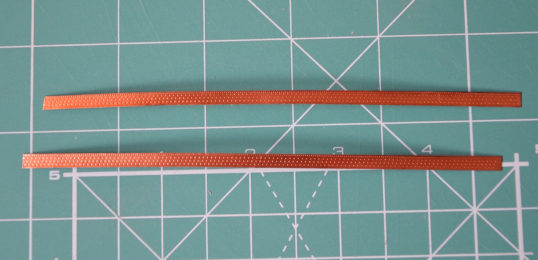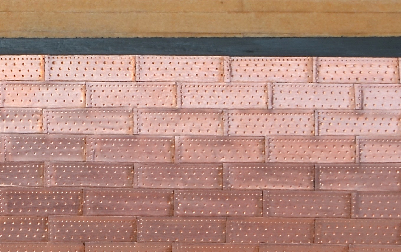 Przed wycięciem pasków imitujących miedziane płyty, przyklejałem dłuższy pasek miedzi (ok. 13,5 cm) do maty za pomocą taśmy malarskiej. Następnie na tak przyklejonym pasku wykonywałem imitację gwoździowania za pomocą radełka; do wykonania imitacji gwoździowania na obrzeżach używałem radełka Trumpetera o gęsto rozstawionych zębach (przez Trumpetera oznaczonego jako nr A), a do gwoździowania w centralnej płaszczyźnie płyty radełka o rzadszych zębach (oznaczonego jako nr D).
