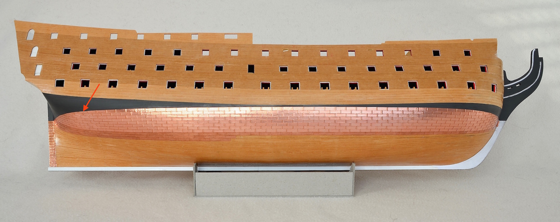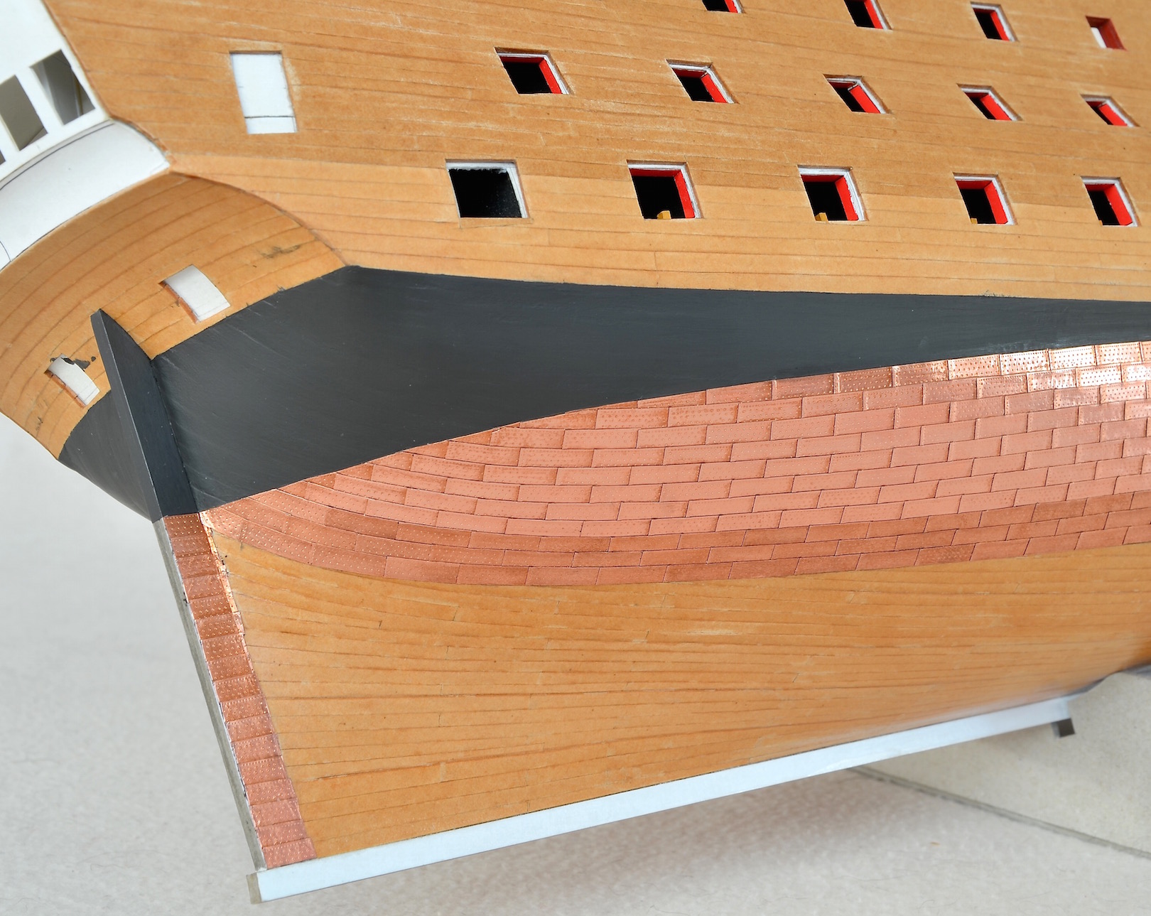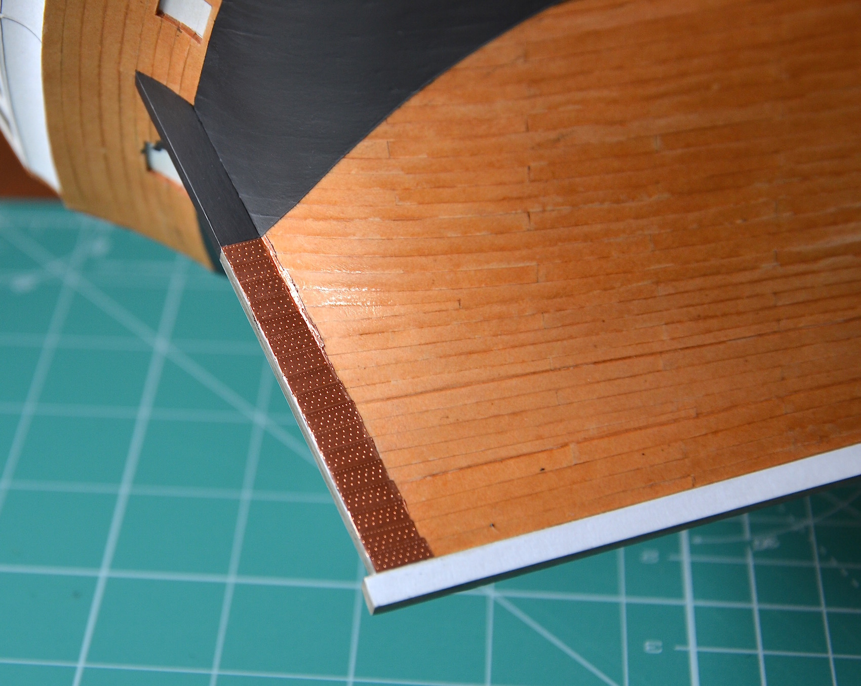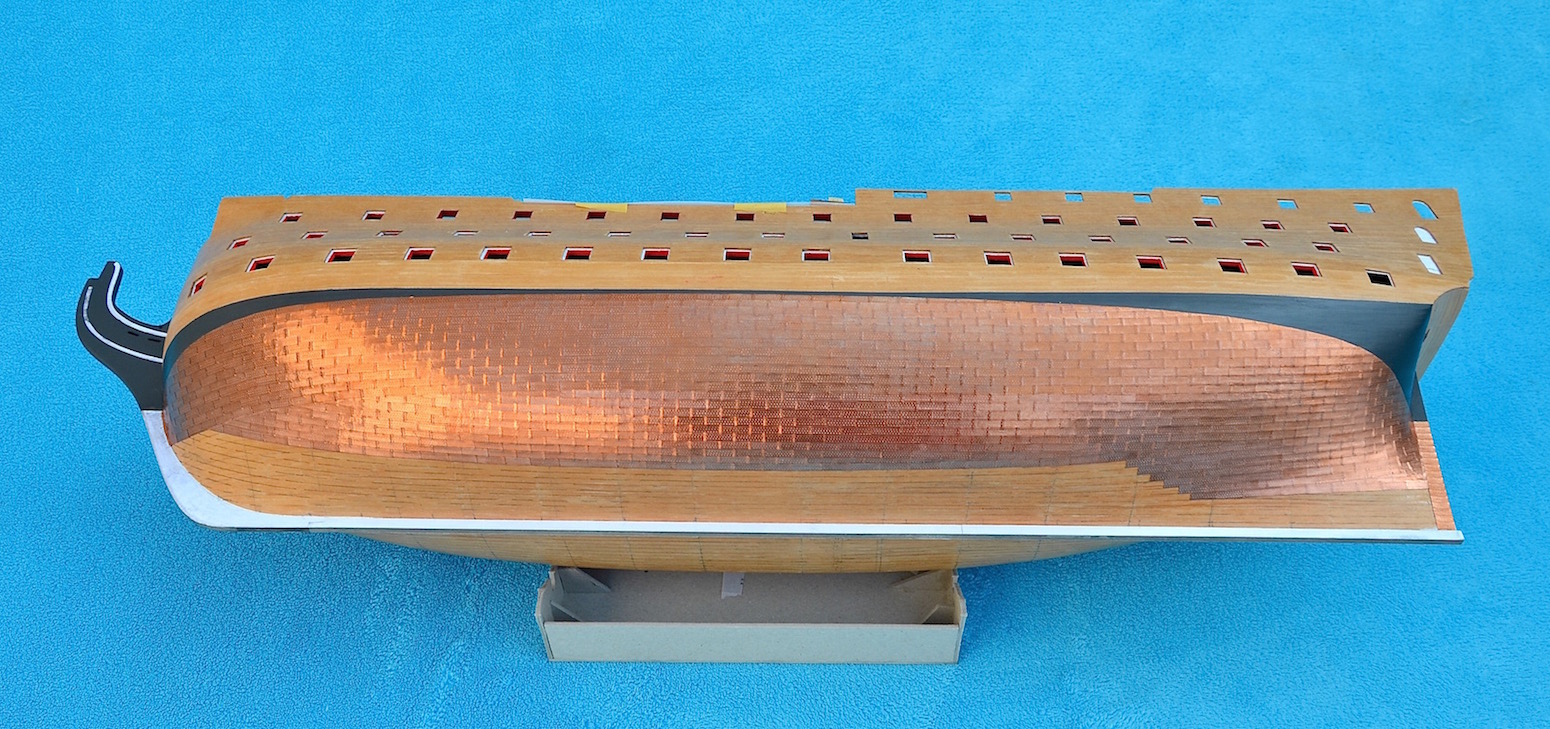 1) W marcu 1780 roku dno statku poniżej linii wodnej zostało osłonięte 3923 miedzianymi arkuszami, celem zapewnienia ochrony części dennej przed świdrakiem okrętowym. Płyty miały długość 4 stóp i szerokość 14 cali, co dla skali 1:96 daje płytkę o długości 12,7 mm i szerokości 3,7 mm. Moje płytki są ciut niewymiarowe, bo mają 13 mm długości i 4 mm szerokości – będę musiał z tym żyć.