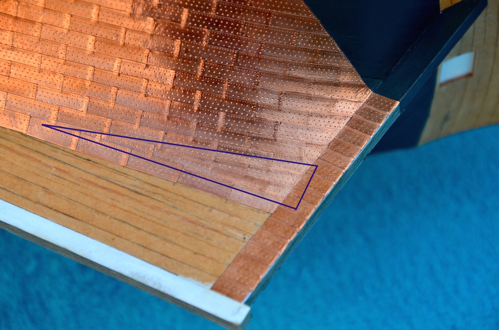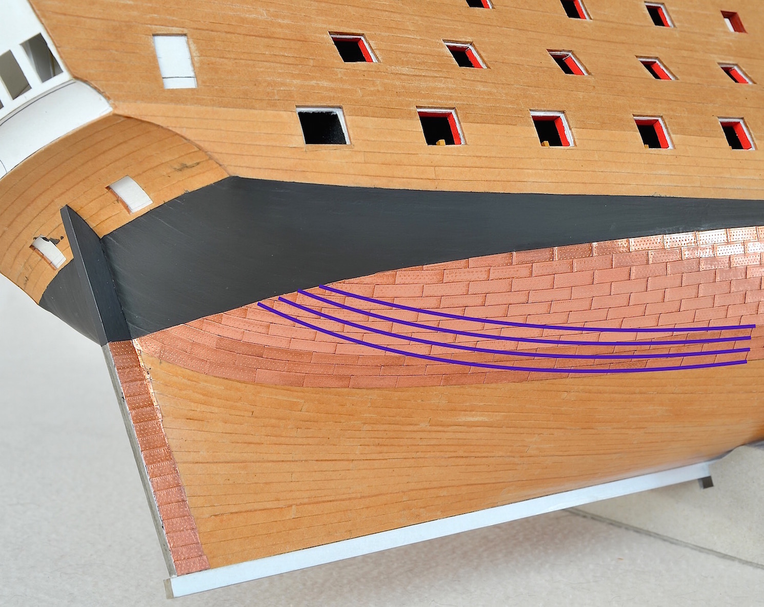 Dzisiaj rzecz nie o postępach w budowie, ale o tym dlaczego czasami trzeba coś zdemolować, aby było dobrze. Po naklejeniu płyt zorientowałem się, że zacząłem układać miedziane poszycie zbyt blisko rufy. Otóż pasy miedziane powinny tutaj przebiegać mniej więcej zgodnie z układem planek. Na poniższym zdjęciu ten właściwy układ zaznaczyłem fioletowymi liniami. Widać wyraźnie jak ułożone poszycie odbiega od prawidłowego układu.