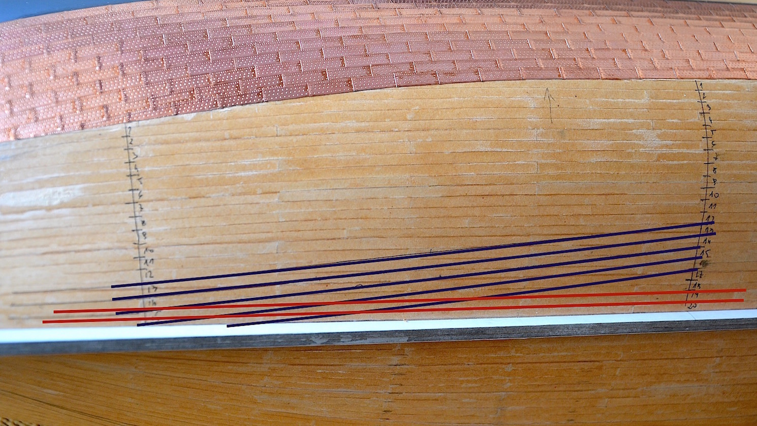 Kontynuowanie układania płyt z zachowaniem dotychczasowego ich przebiegu skutkowałoby w pewnym momencie niewłaściwym ich ułożeniem w części rufowej i w dennej. Na zdjęciu poniżej widać, że w części centralnej kadłuba pozostało mi jeszcze miejsca na 20 rzędów płyt, podczas gdy w części bliżej rufy miejsca było jedynie na 15 rzędów. Takie dalsze układanie skutkowałoby tym, że płyty w części dennej, przy kilu układałyby się ukośnie (linie koloru granatowego), a powinny równolegle (linie koloru czerwonego) tak jak planki.