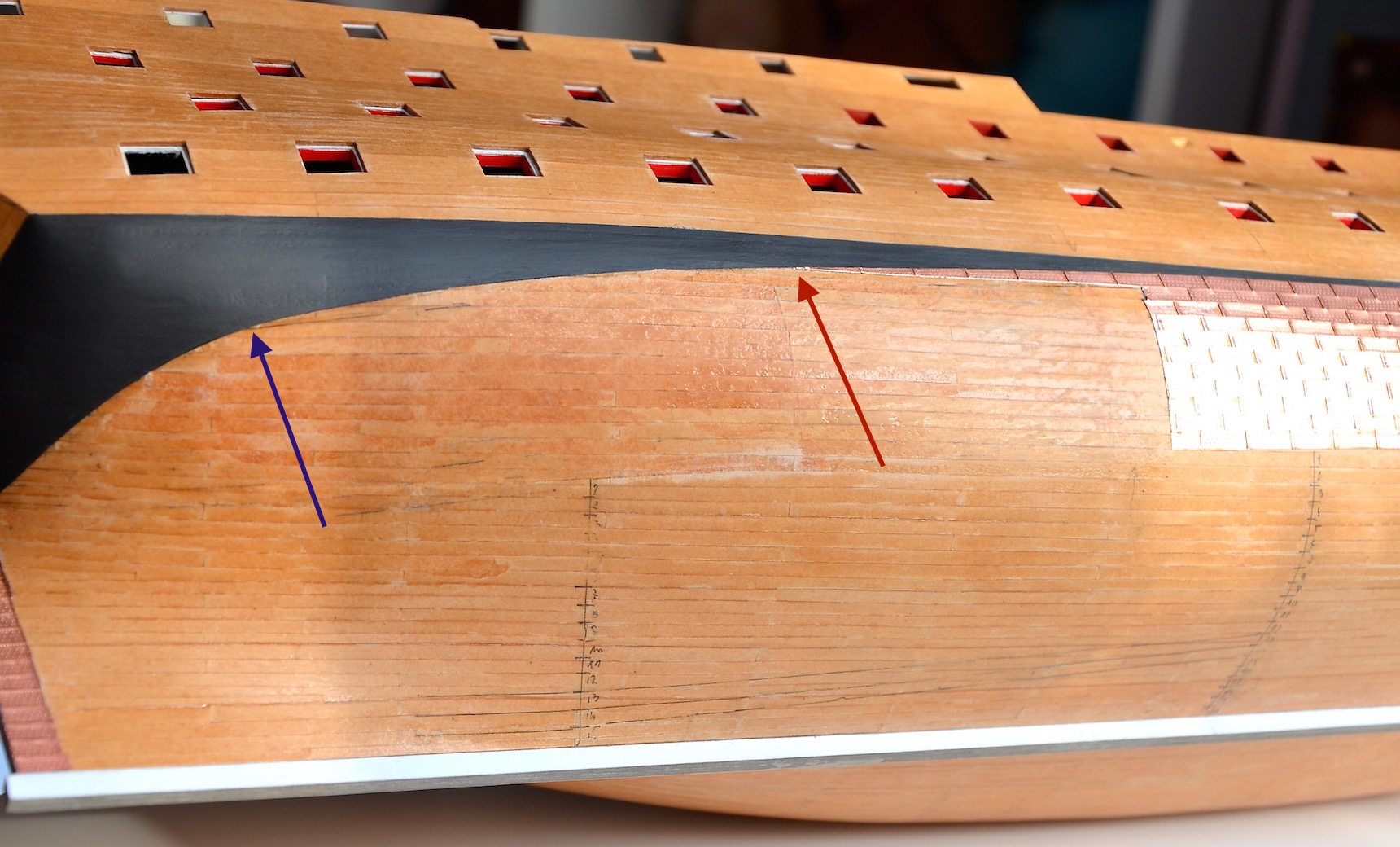 3) Płyty na burtach układane są rzędami poziomymi, odpowiadającymi mniej więcej układowi planek. W każdym rzędzie płyty są układane w ten sposób, że górna krawędź niższej płyty zachodzi na dolną krawędź płyty położonej powyżej, a tylna krawędź płyty znajdującej się bliżej dziobu zachodzi na przednią krawędź płyty znajdującej się bliżej rufy. Oznacza to, że układanie płyt należy rozpocząć od rufy w kierunku dziobu i od linii wodnej w kierunku kilu (miejsce rozpoczęcia układania płyt oznaczyłem na fotce czerwoną strzałką).