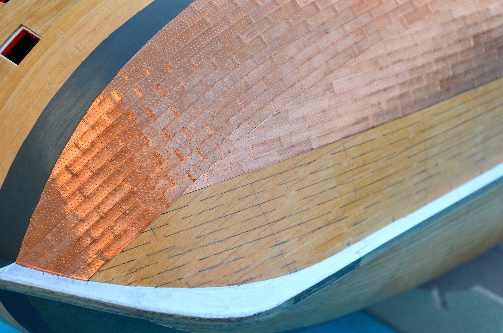 8) Płyty miedziane należy ułożyć także na sterze. Tutaj płyty układane są równolegle do linii wodnej. Na pionowych krawędziach steru, podobnie jak na pionowych krawędziach stewy rufowej, płyty należy układać równolegle do linii wodnej i delikatnie wywijać na boczne płaszczyzny steru lub stewy. Okucia steru mocowane są na ułożonych wcześniej miedzianych płytach i nie są pokrywane miedzią.